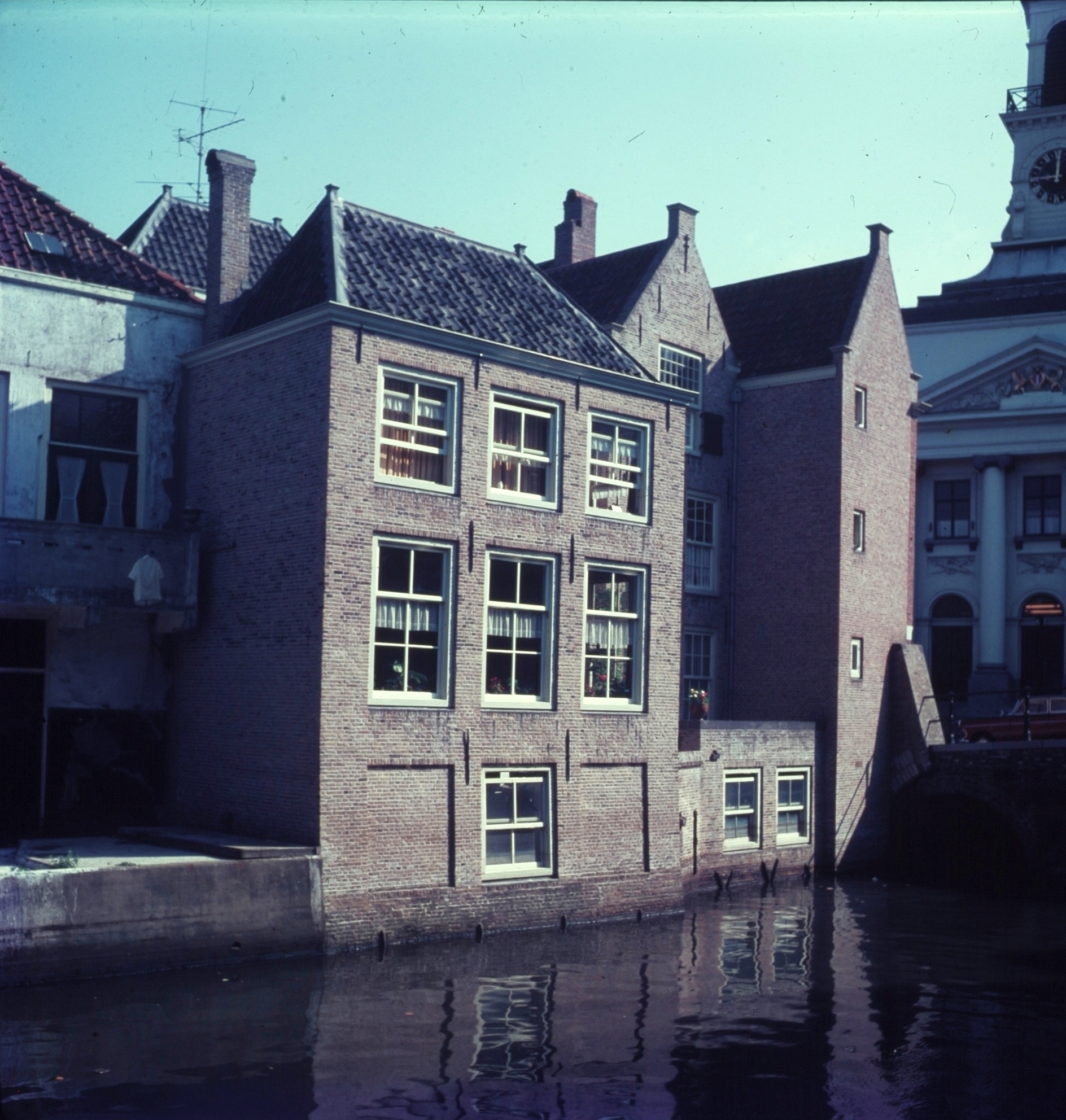 - Een watergevel aan de Voorstraatshaven (voorkant huis Grotekerksbuurt), op de achtergrond rechts het stadhuis en de Lombardbrug.