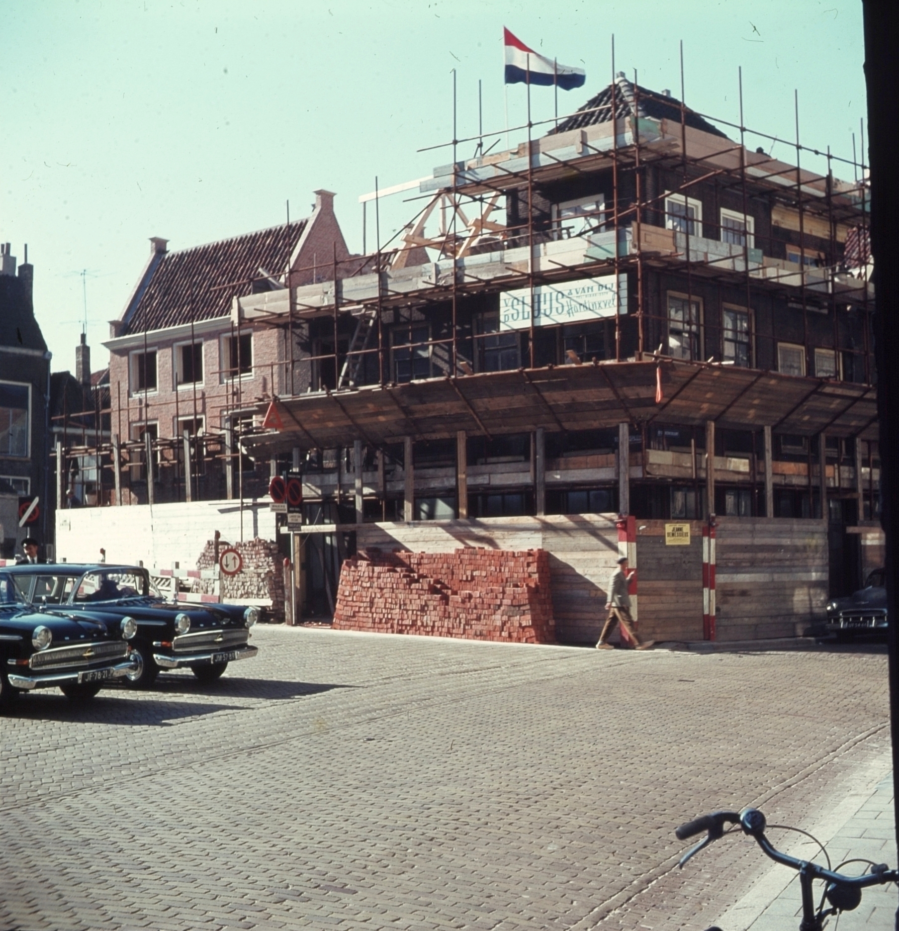 Restauratie van het hoekpand Stadhuisplein/Grotekerksbuurt, gezien vanaf de Grotekerksbuurt; geheel links de Lombardbrug.