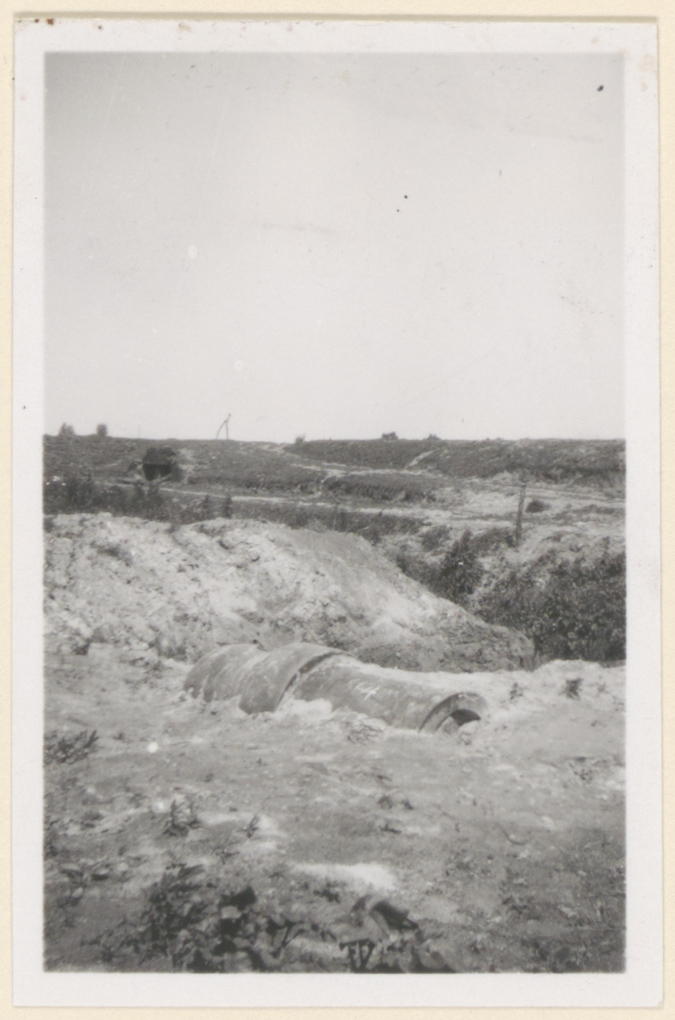 - Verwoestingen door oorlogshandelingen tijdens de meidagen 1940 in Mookhoek. Li. Batterij de Wacht 2de kanon achterste deel 15 meter weggeslingerd door projectiel in de loop ontploft voorste deel uit elkaar gesprongen
