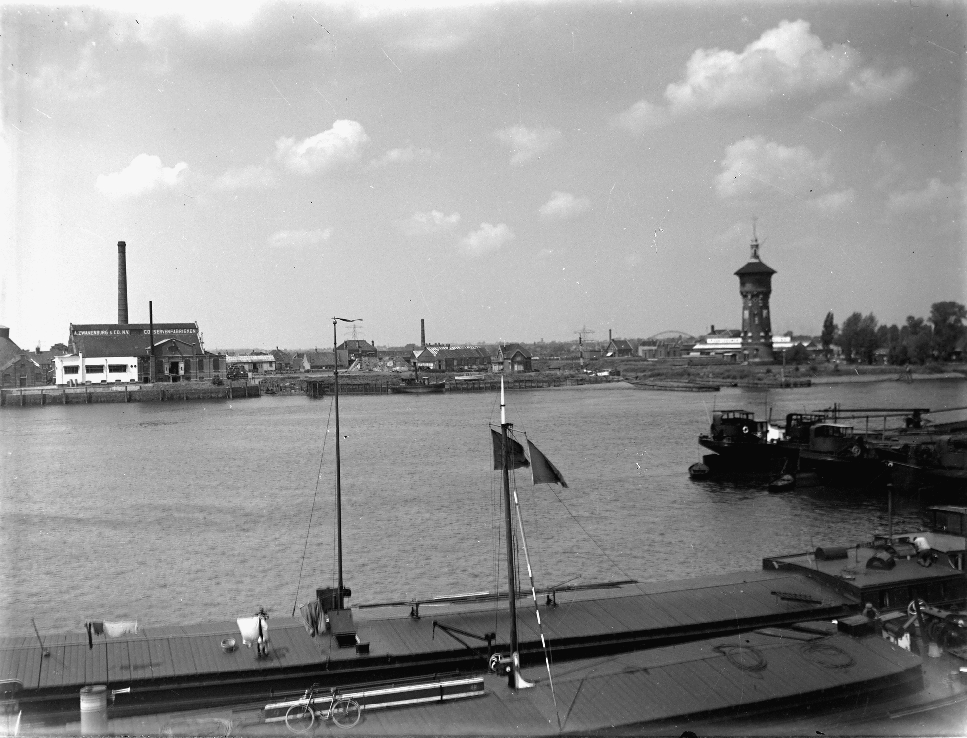 - Gezicht op de Oude Maas en Zwijndrecht vanaf de Buiten Walevest. Links conservenfabriek Zwanenburg, rechts de watertoren.
