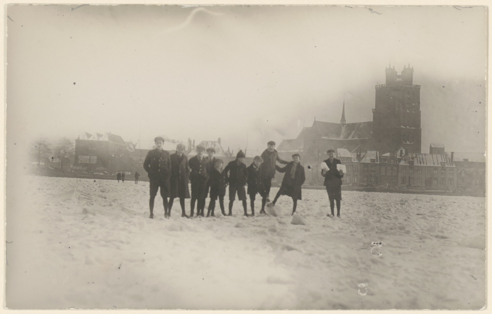 - De strenge winter van 1928/1929. Jongens poserend op de Bevroren Oude Maas voor de Grote Kerk. Allemaal in driekwart broek en maillots