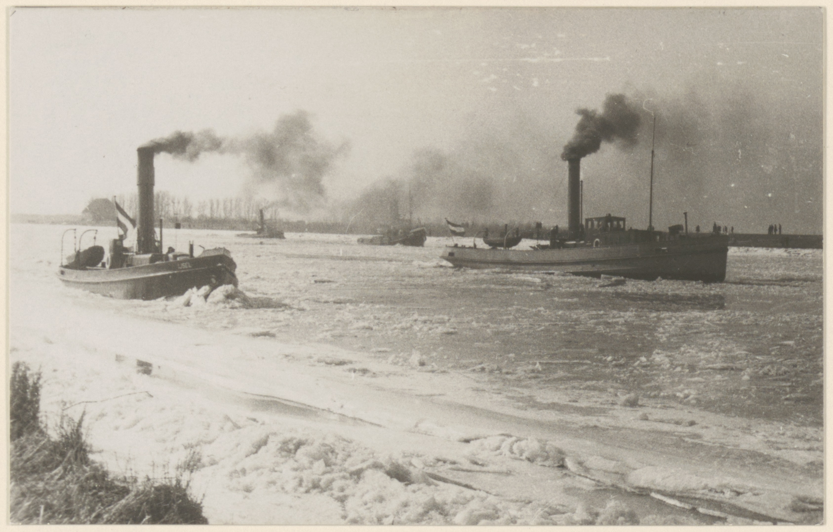 De strenge winter van 1928/1929. IJsbrekers in colonne op de bevroren Oude Maas