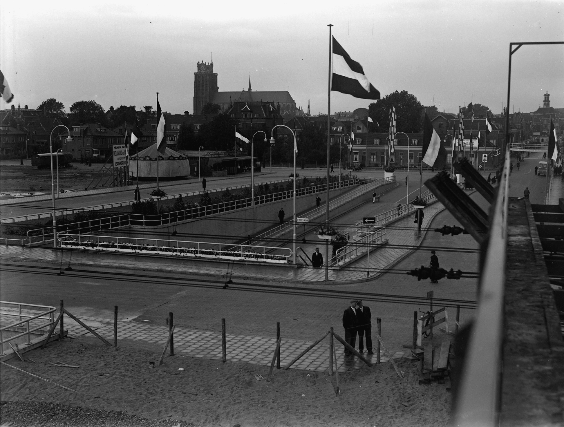 Opening van de Krispijntunnel, gezien vanaf de voetgangersbrug over het spoor in de richting van de Spuiweg en de Kilwijkstraat. De poffertjeskraam en draaimolen bleven een week na de opening staan.
