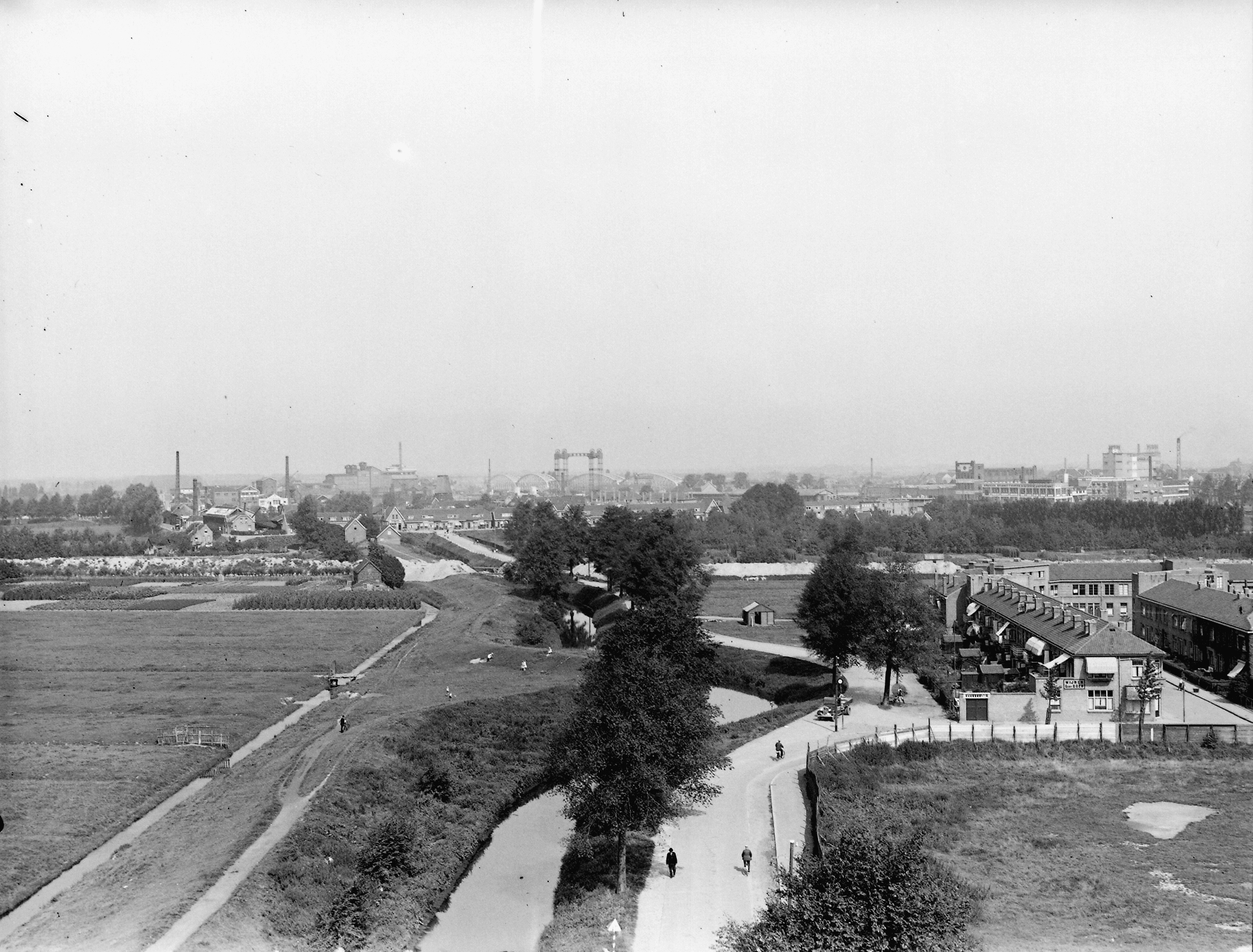 Panorama vanaf de Torenschool aan de Brouwersdijk langs Vuile Vliet naar het Noorden. Rechts de Jacob Catsstraat en de Vossiusstraat. Op de achtergrond zijn v.l.n.r. te onderscheiden Chemproha-fabriek in Zwijndrecht, de romp van molen De Pelikaan, de heftoren van de Dokbrug, de spoorbrug over de Oude Maas en de fabrieken E.M.F. en Victoria.