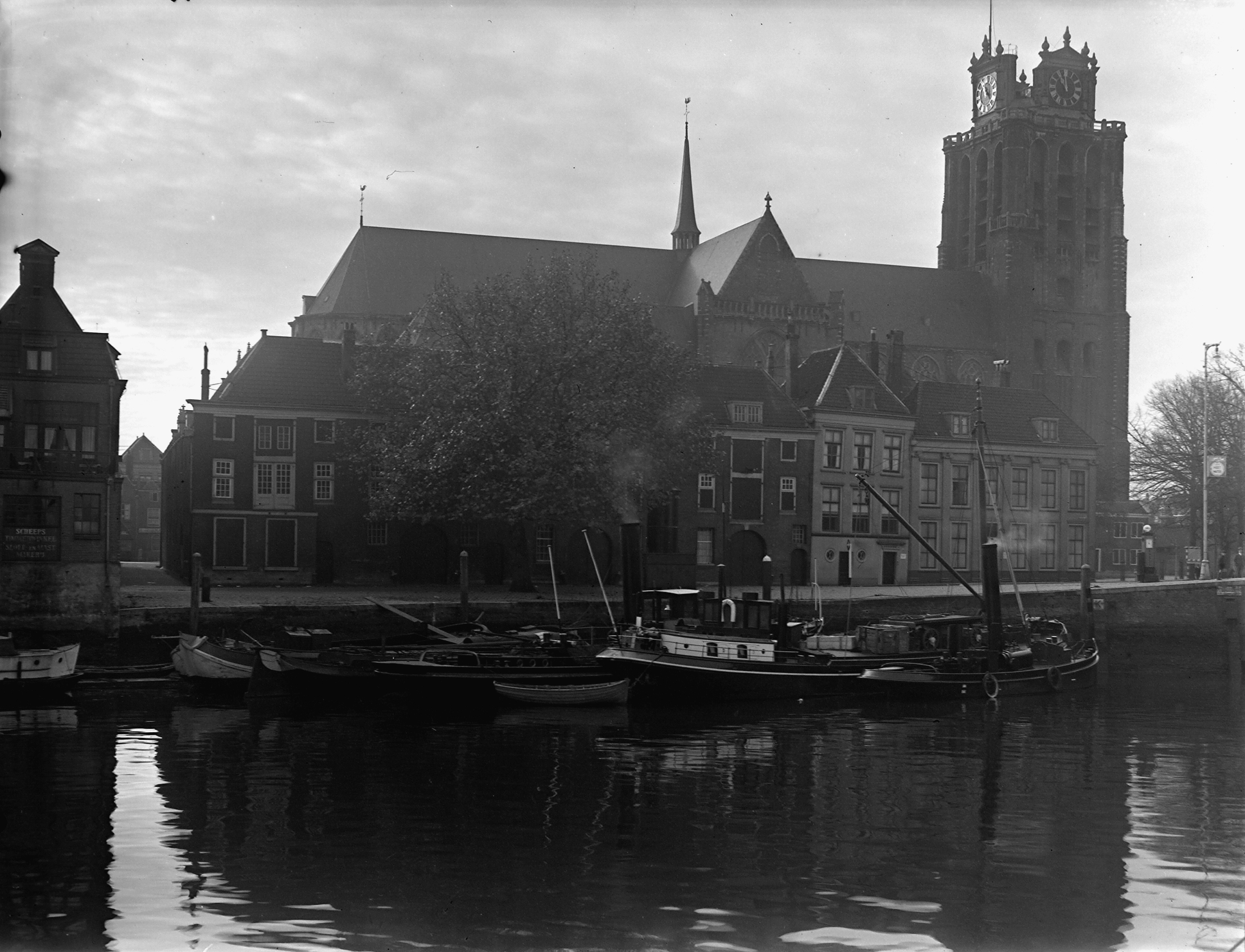 De Nieuwe Haven met op de achtergrond links de Kerkstraat, het Rijksmagazijn aan de Houttuinen en de Grote Kerk.