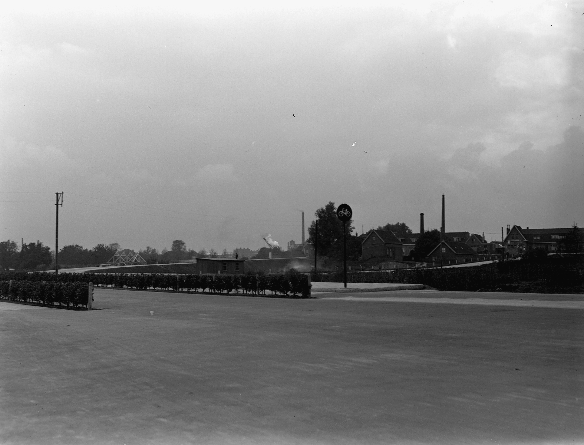 - Straatweg en Weeskinderendijk met fabriekspijpen van wasserij Ozon en houthandel Berger, gezien vanaf de Hugo de Grootlaan.