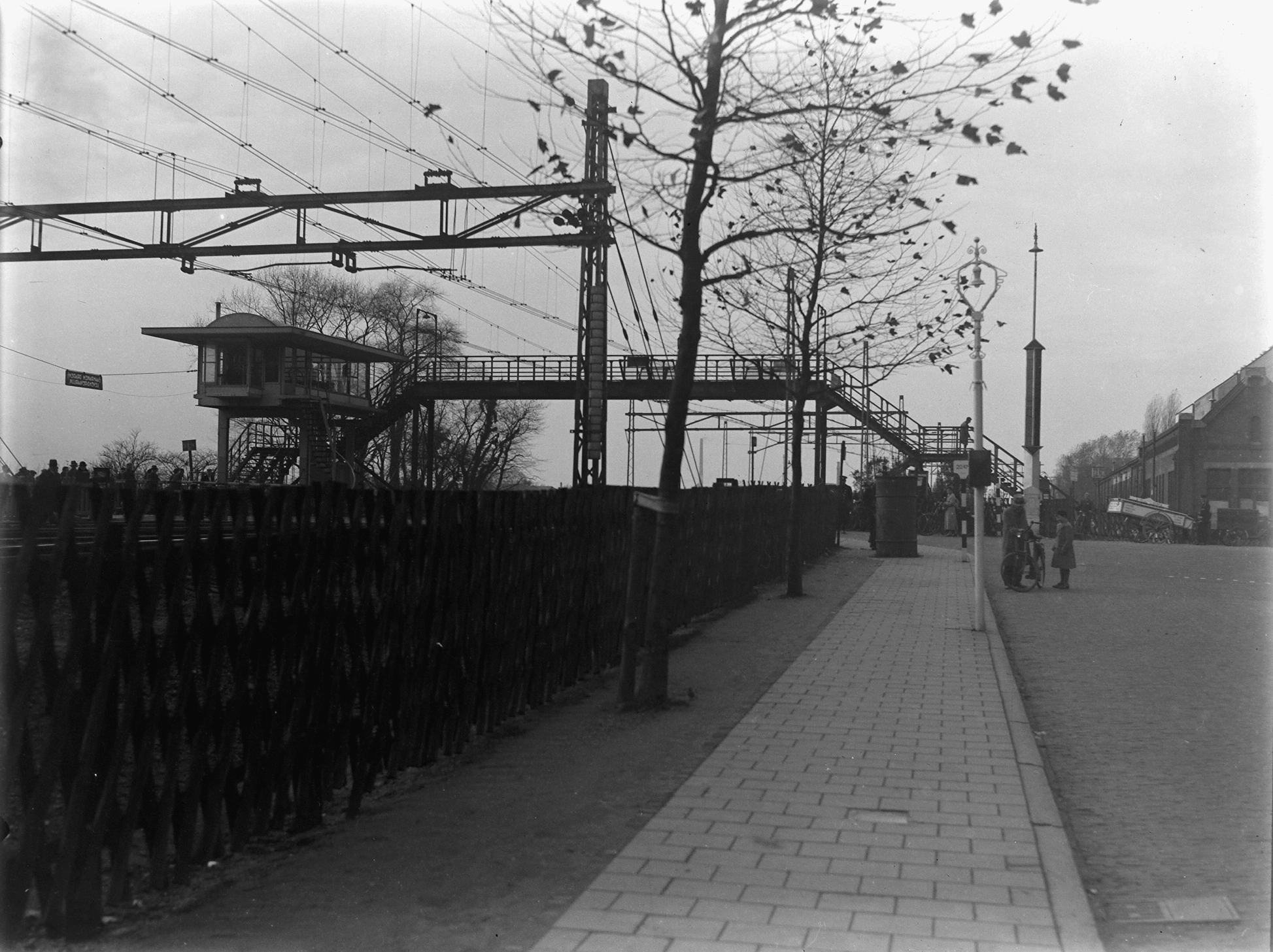 - Seinhuis en voetgangersbrug over het spoor bij de overweg aan de Spuiweg, gezien vanaf de Burgemeester de Raadtsingel naar het westen. Rechts staat de fabriek van Lips.