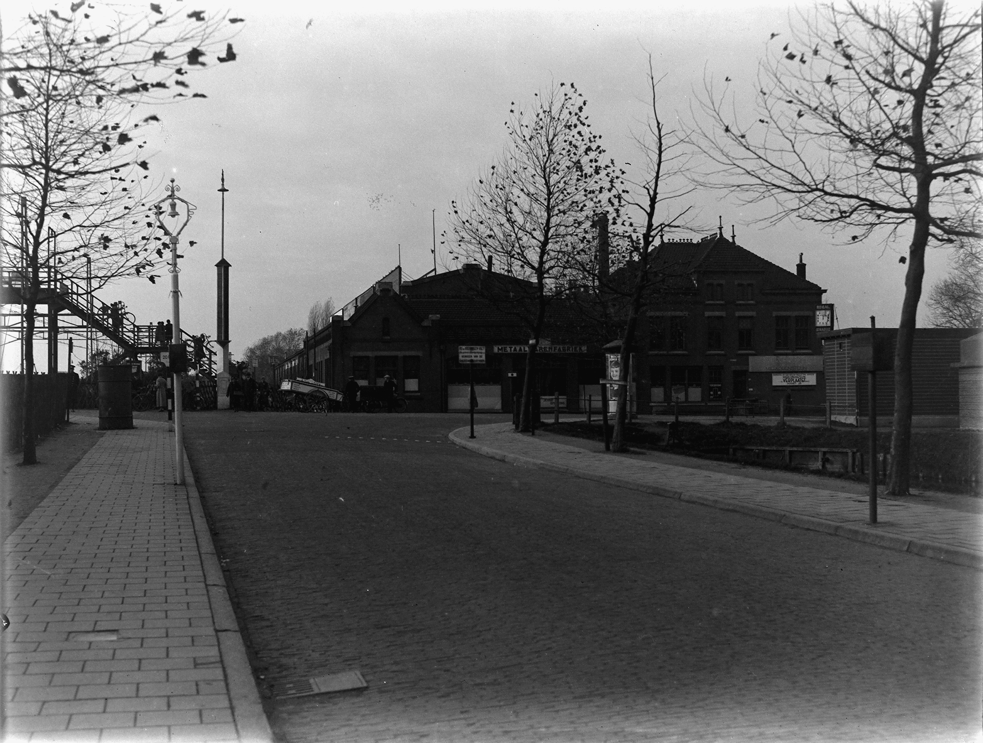 Overweg met voetgangersbrug en de fabriek van Lips aan de Spuiweg, gezien vanaf de Burgemeester de Raadtsingel naar het westen.