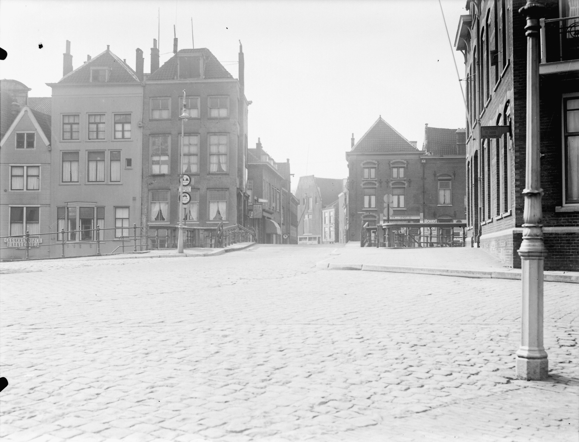 - De Leuvebrug vanaf Korte Geldersekade naar het zuiden, richting Voorstraat (panden links) en Suikerstraat (midden).