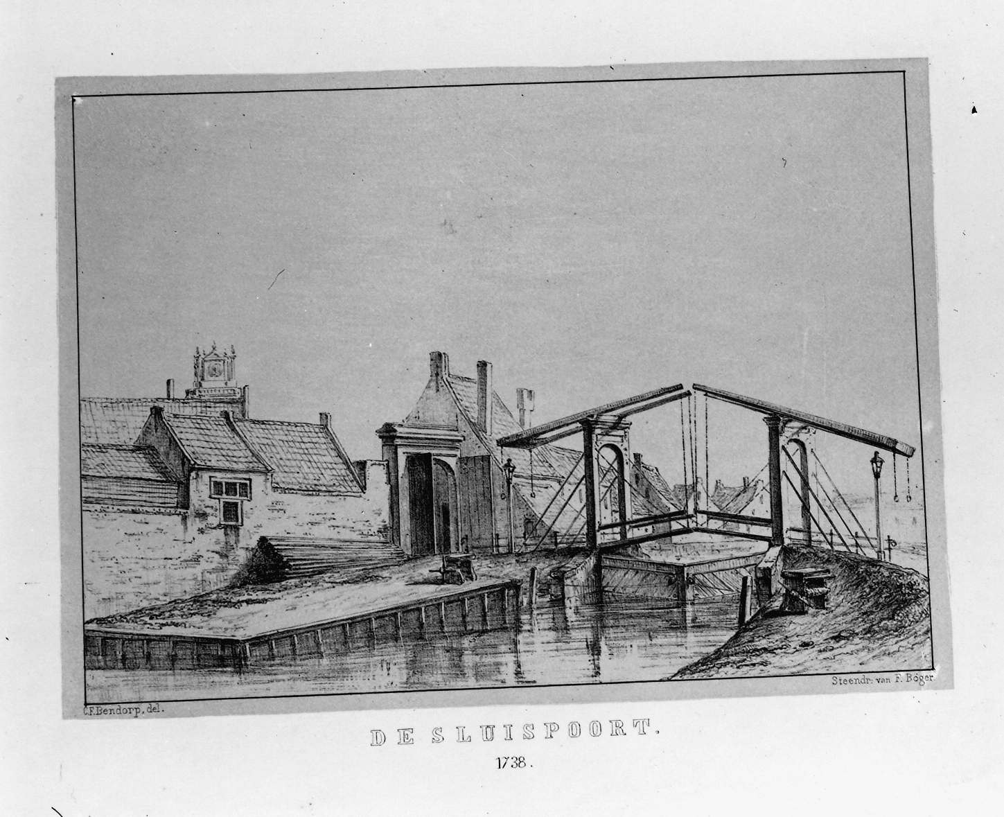 - De Sluisbrug en Sluispoort gezien vanaf de Achterhakkers in de richting van de Prinsenstraat. Links op de achtergrond de Grote Kerk.