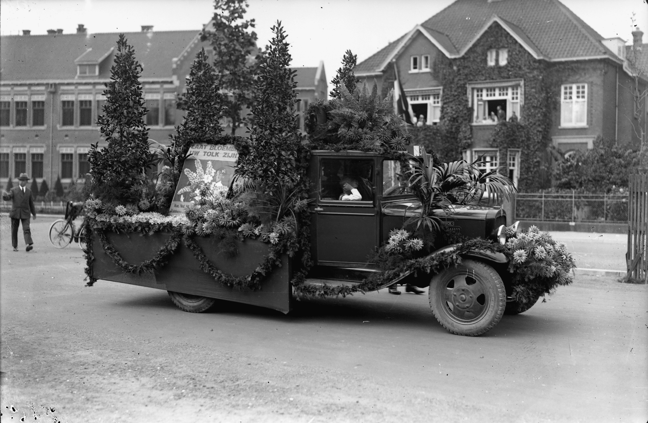 - Een met bloemen versierde vrachtwagen in het Oranjepark, de HBS links op de achtergrond.