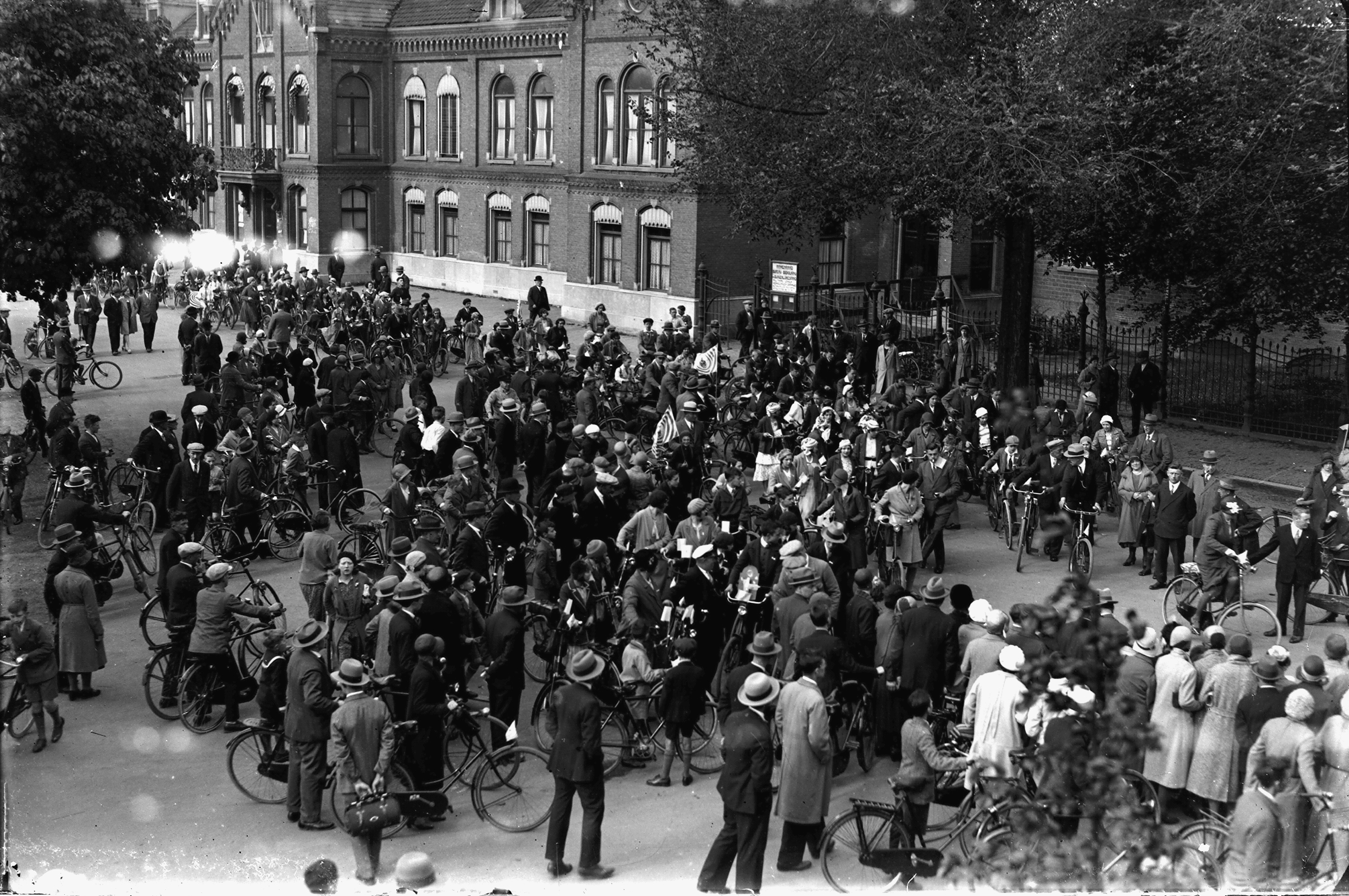 Groep fietsers op het Beverwijcksplein voor het gebouw van de Raad van Arbeid.