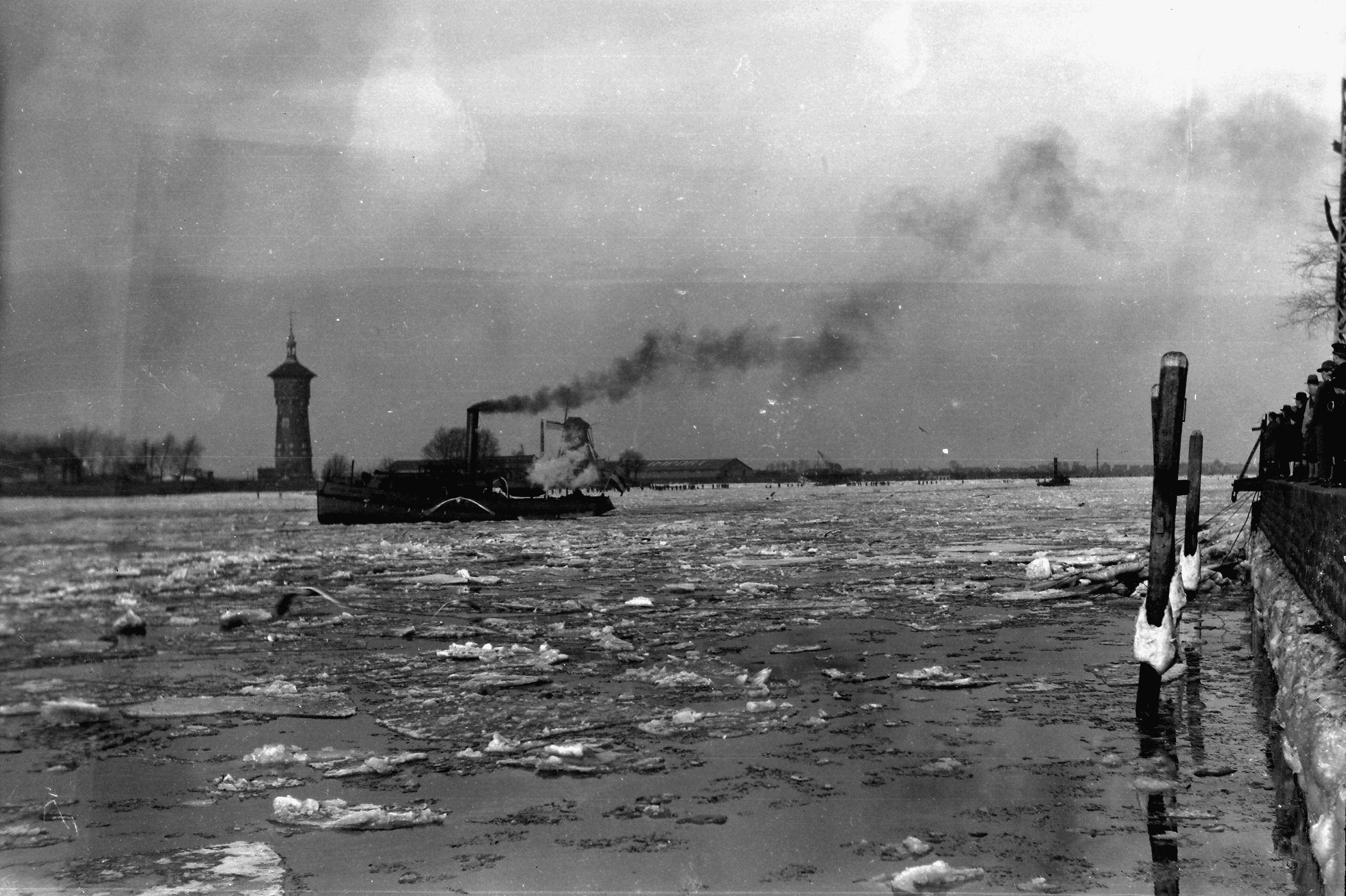 - Toeschouwers kijken vanaf Hooikade of Buiten Walevest naar een raderboot tussen het drijfijs op de Oude Maas. De watertoren staat in Zwijndrecht.