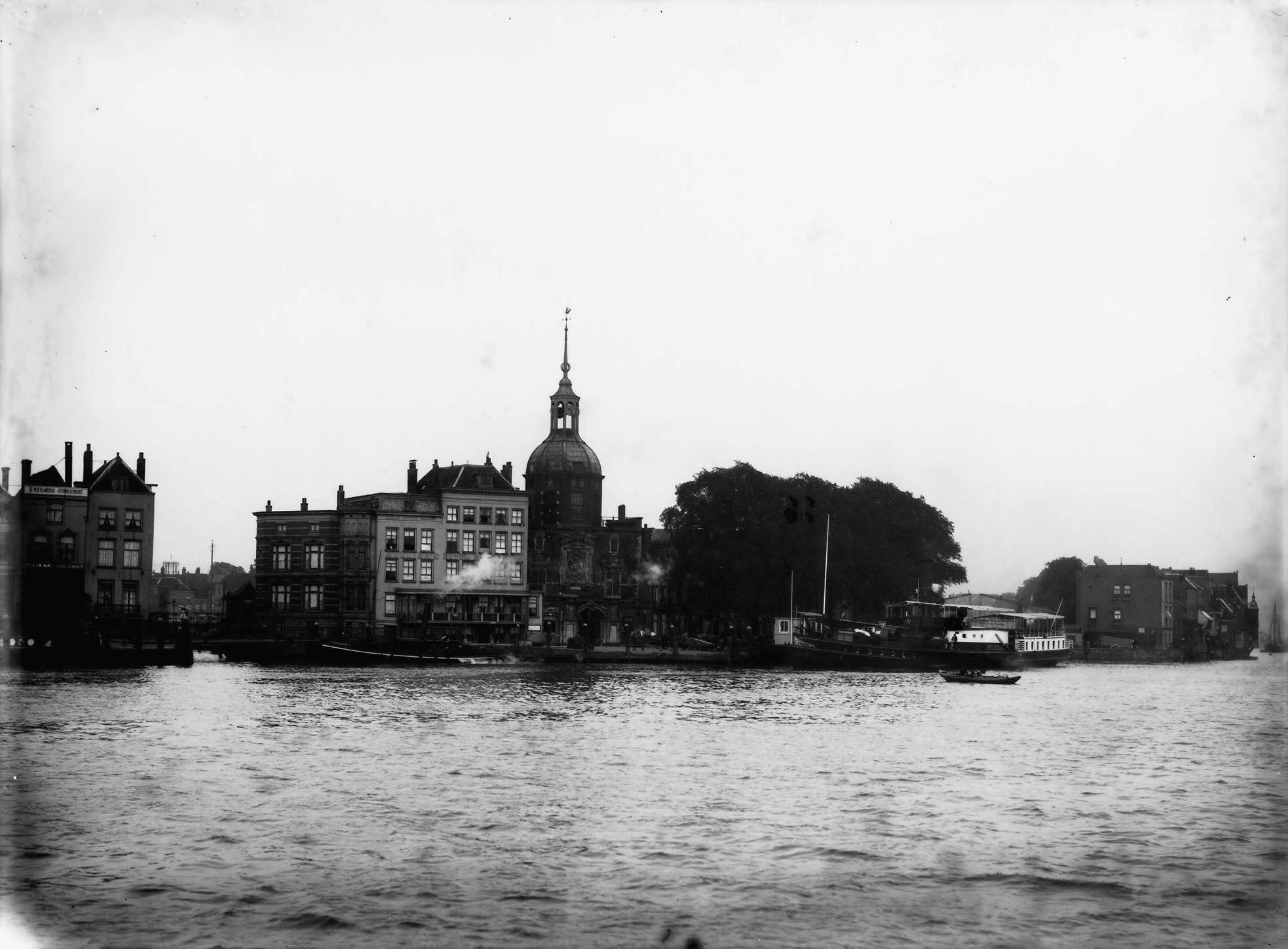 - Een raderboot van Fop Smit ligt afgemeerd aan het Groothoofd. Tussen Boombrug (links) en Groothoofdspoort staat Hotel Bellevue. Rechts het Damiatebolwerk.