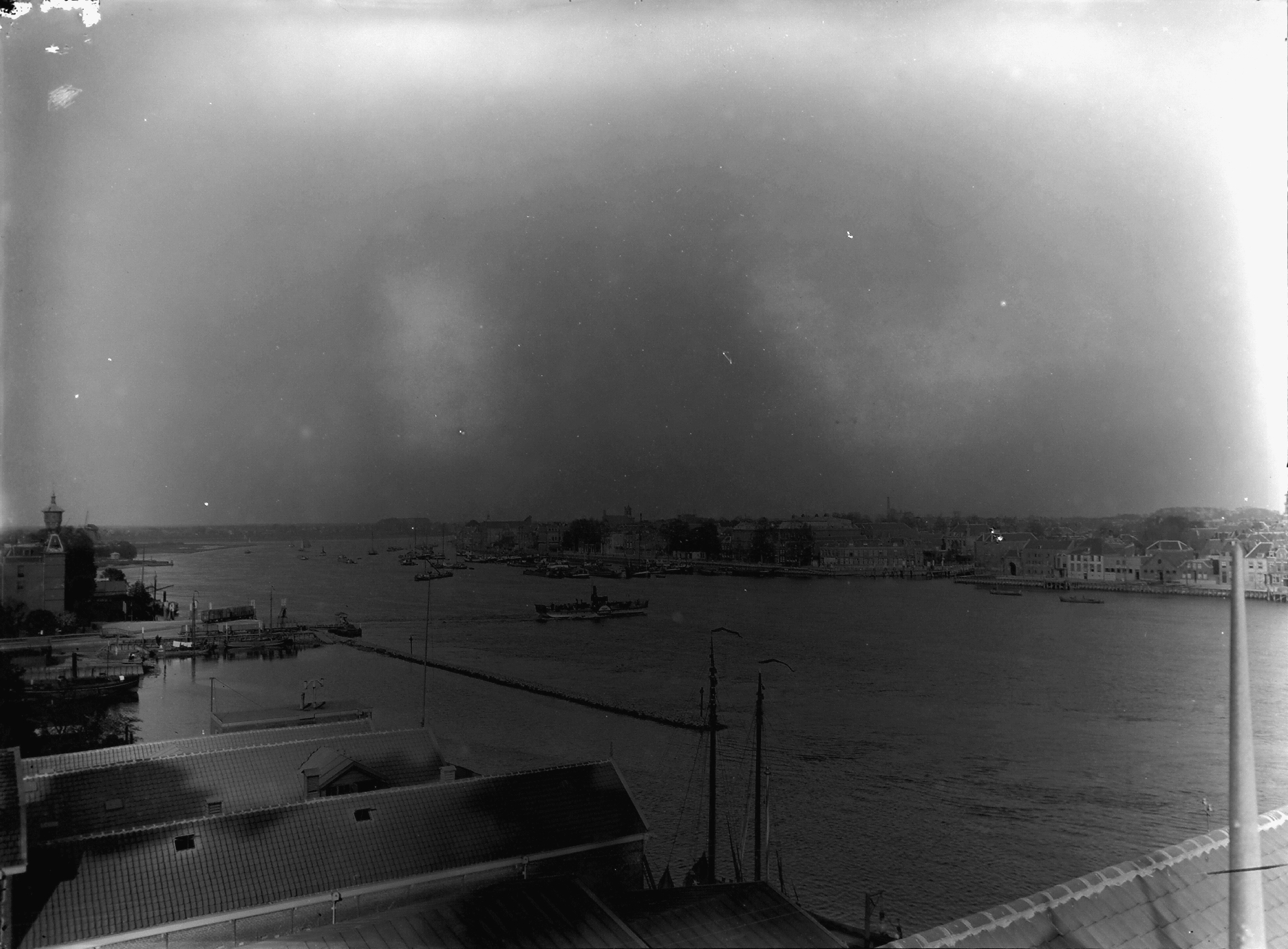 Panorama over de Oude Maas vanuit Zwijndrecht in oostelijke richting. Links hotel Het Witte Paard aan het Veerplein met daarachter de watertoren en molen Welgelegen in Zwijndrecht. Op de achtergrond de riviersplitsing van Beneden-Merwede, de Noord en de Oude Maas. Rechts op de Dordtse oever zijn v.l.n.r. te onderscheiden de Buiten Walevest met de Pontonnierskazerne, de ingang van de Nieuwe Haven bij het Zwijndrechts veer, pakhuis Rusland, de Catrijnepoort en de Hooikade. Aan de horizon links ligt Papendrecht.