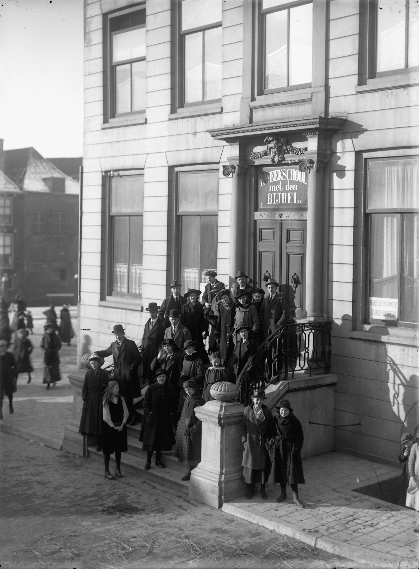 - Personeel van de Kweekschool met den bijbel aan het Blauwpoortsplein.