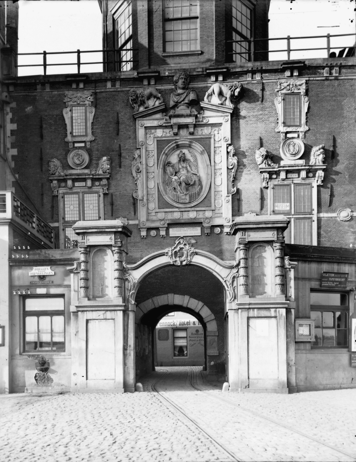 - De rivierzijde van de Groothoofdspoort waar rails van de paardentram onderdoor lopen. Door de poort is hotel Pennock te zien op de hoek van de Wijnstraat en de Palingstraat.