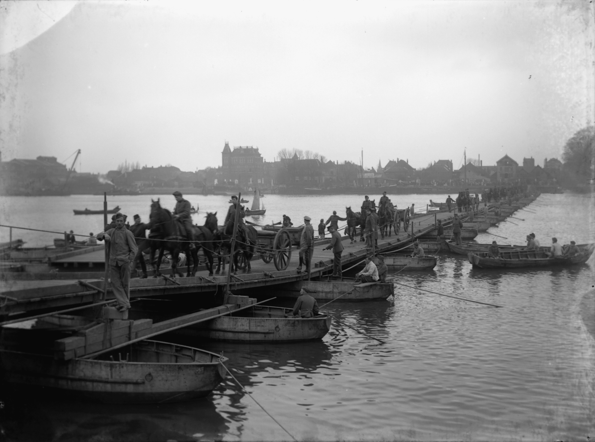 - Een door pontonniers geslagen brug van Dordrecht naar de Zwijndrechtse oever. Links staat hotel Het Witte paard bij de veersteiger aan het Veerplein.