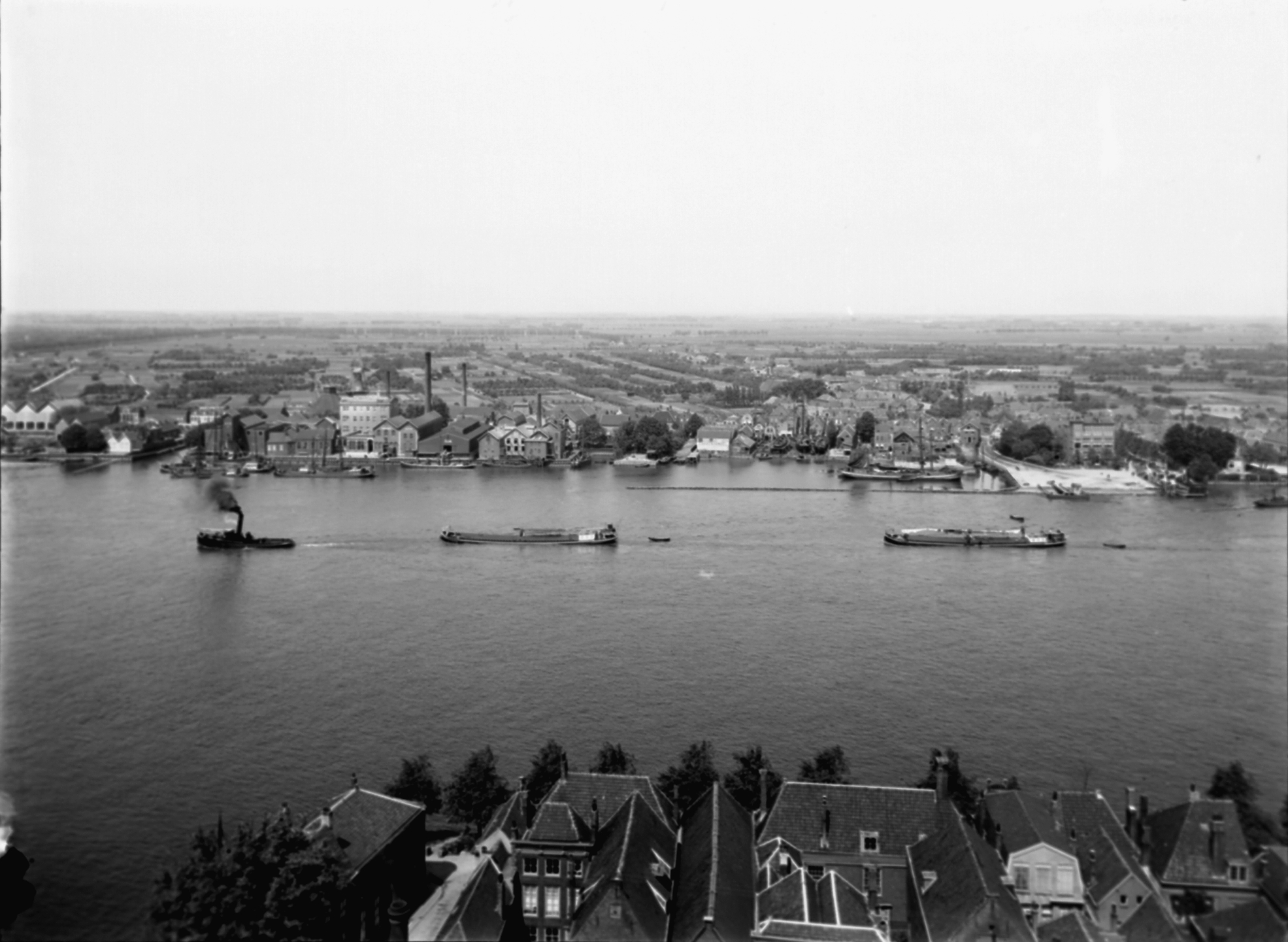 Panorama vanaf de Grote Kerk over de Oude Maas. Hooikade op de voorgrond. Rechts de veersteiger bij hotel Het Witte Paard aan het Veerplein in Zwijndrecht.