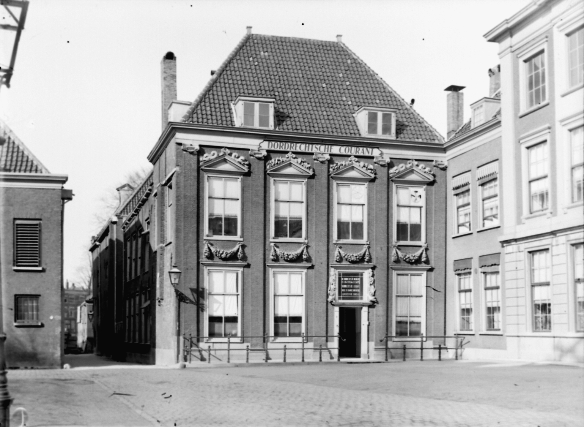 Grotekerksplein met het pand van de Dordrechtsche Courant op de hoek van de Kerkstraat.