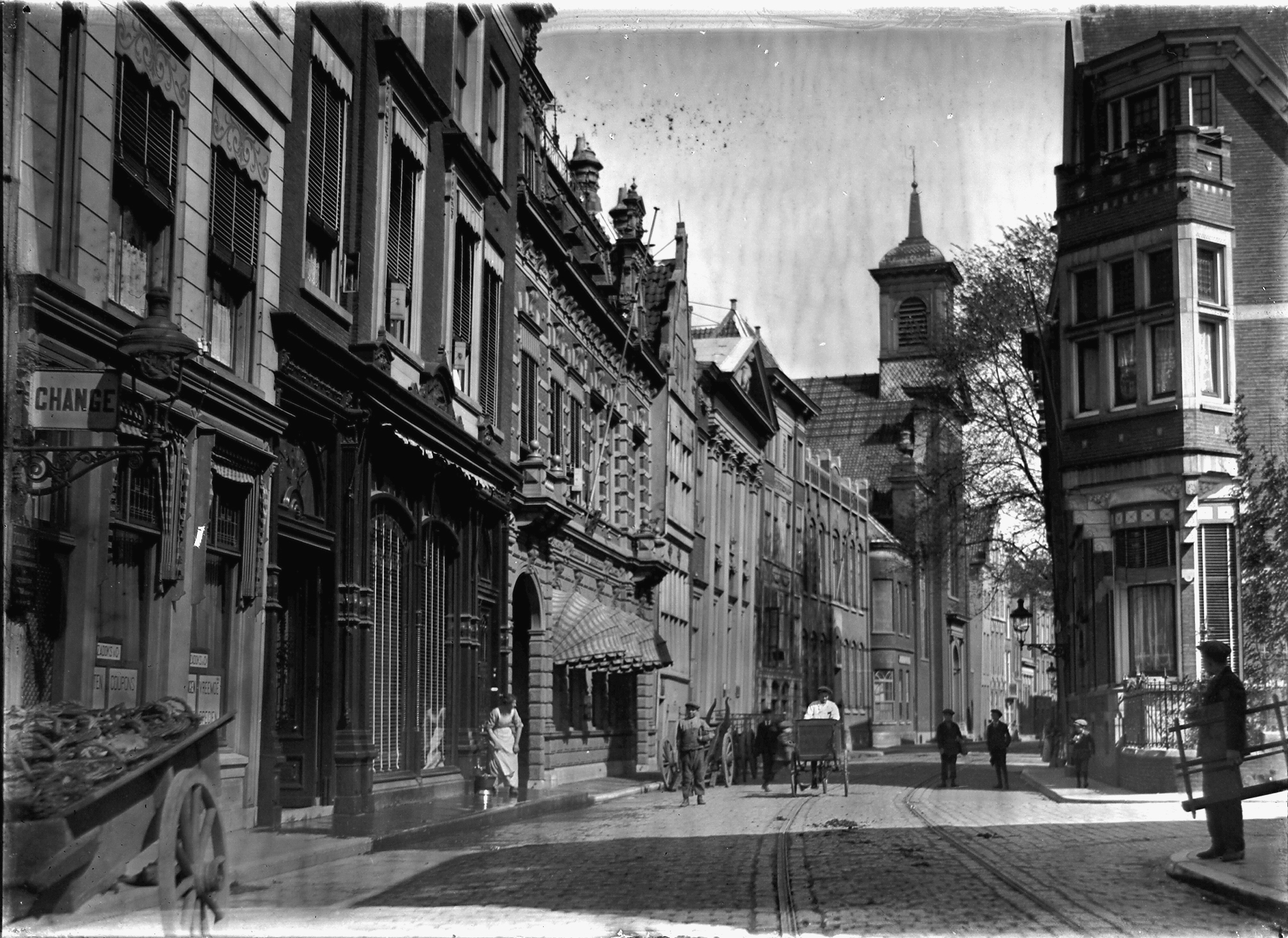 - Wijnstraat met rails van de paardentram vanaf de Nieuwbrug (rechts) richting Bonifatiuskerk.