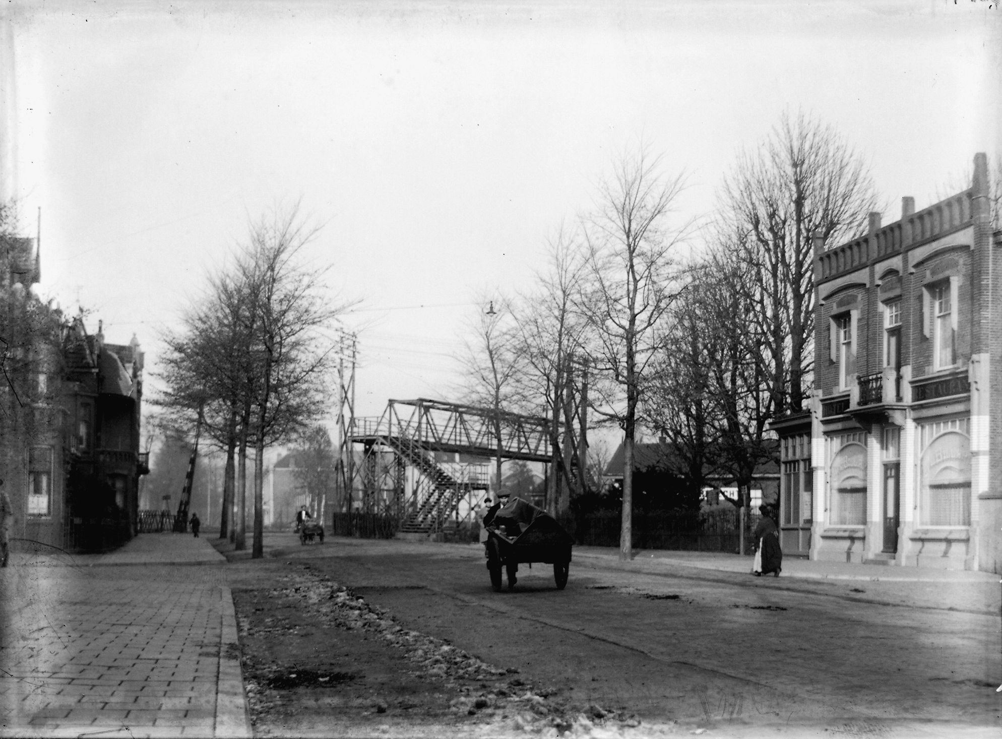 Dubbeldamseweg Zuid in de richting van de voetgangersbrug over het spoor. De zijstraat links is de Mauritsstraat (later Mauritsweg)