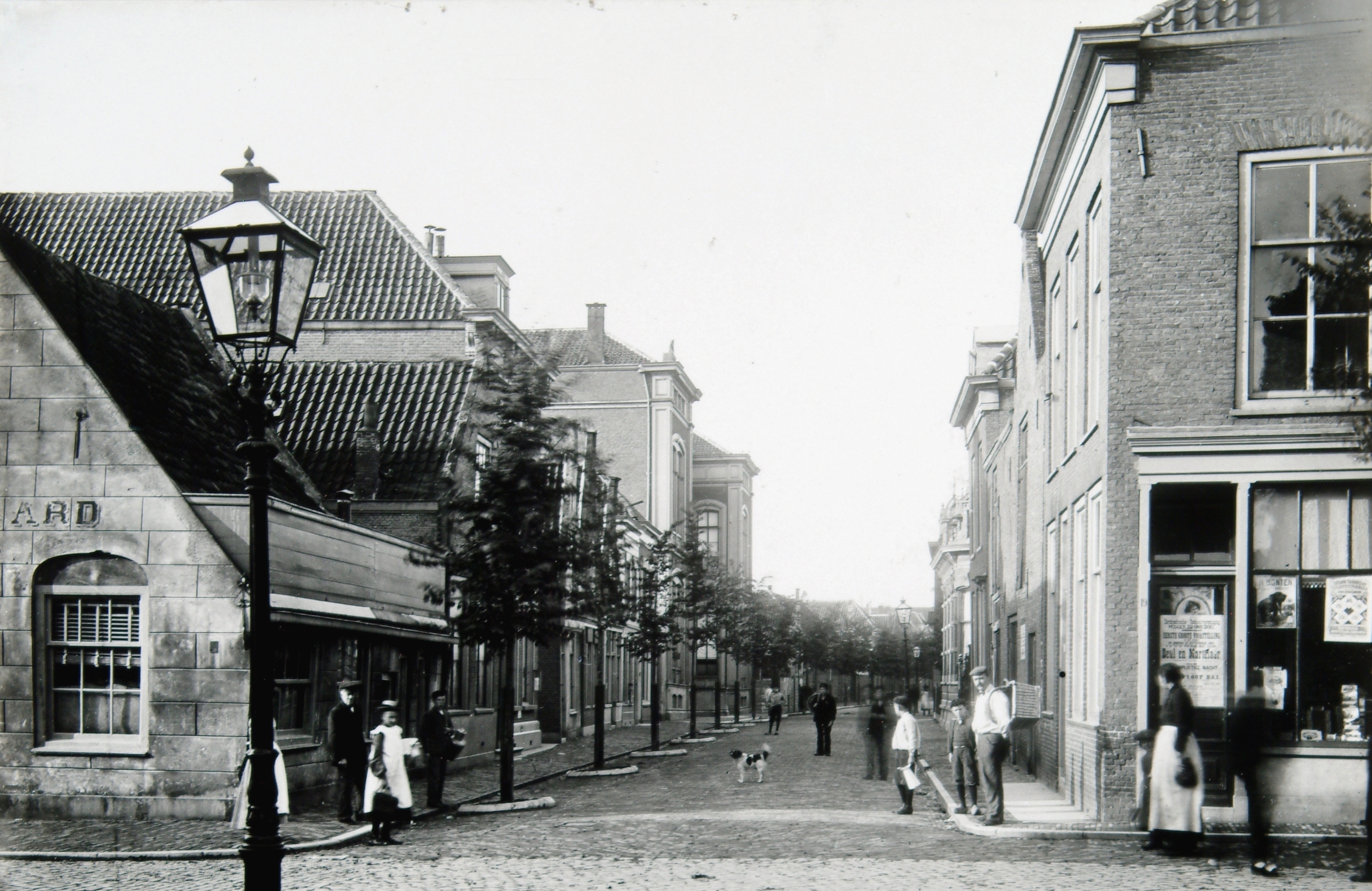 Het Kromhout vanaf de kruising Sint Jorisweg (links) en Sint Jorisbrug. Links is een café, rechts een kruidenierswinkel die bekend stond als het snoepwinkeltje van Littig. In het Kromhout aan de linkerkant staat het Wees- en Armhuis.