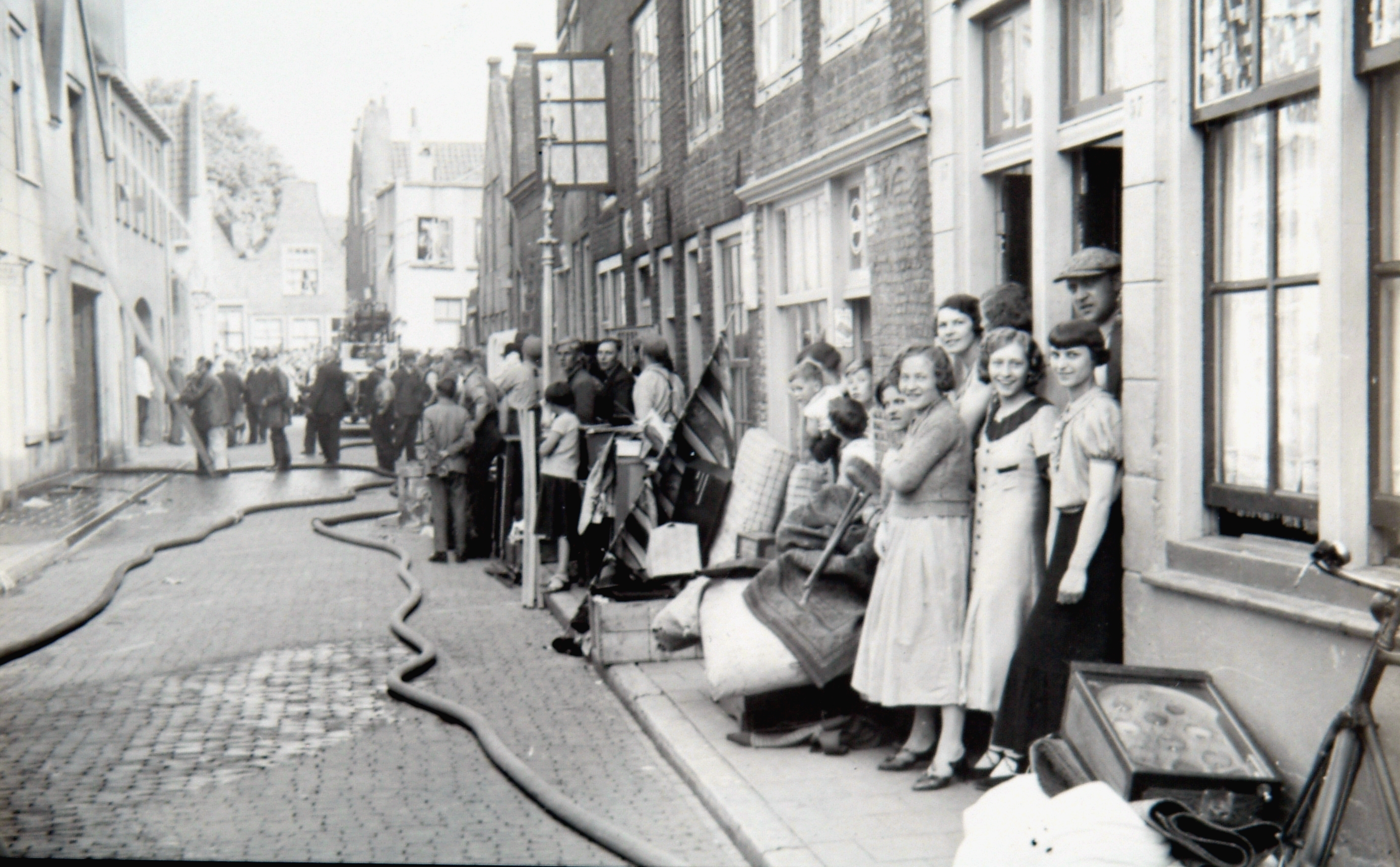 Brand in Kromme Elleboog nr. 72. Geheel op de achtergrond staat het huis met de halsgevel in de Stoofstraat, iets daarvoor aan de rechterkant is de Lindenstraat.