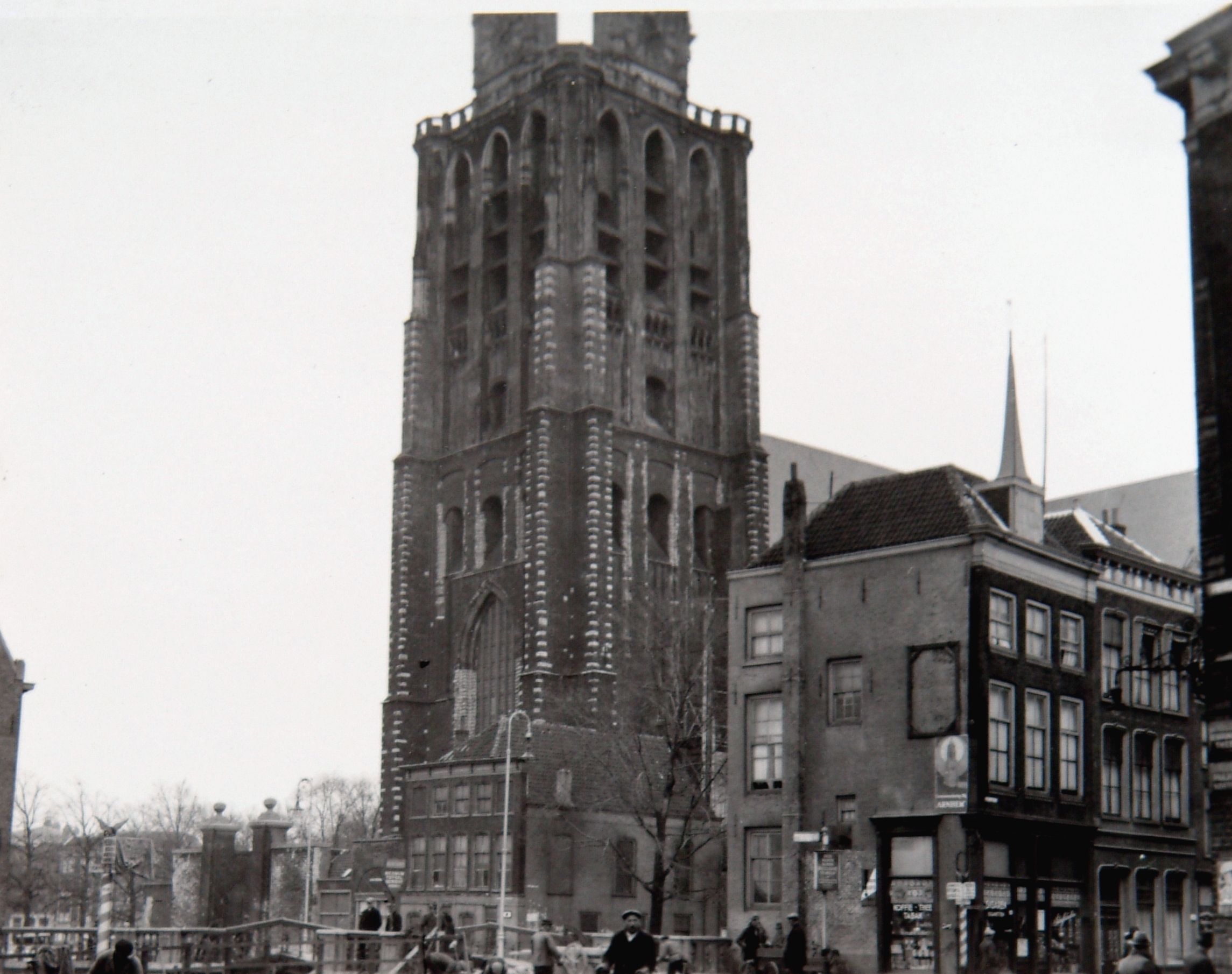 De Grote Kerk met de toegangspoort aan de Geldersekade en de nabij gelegen Leuvebrug. …