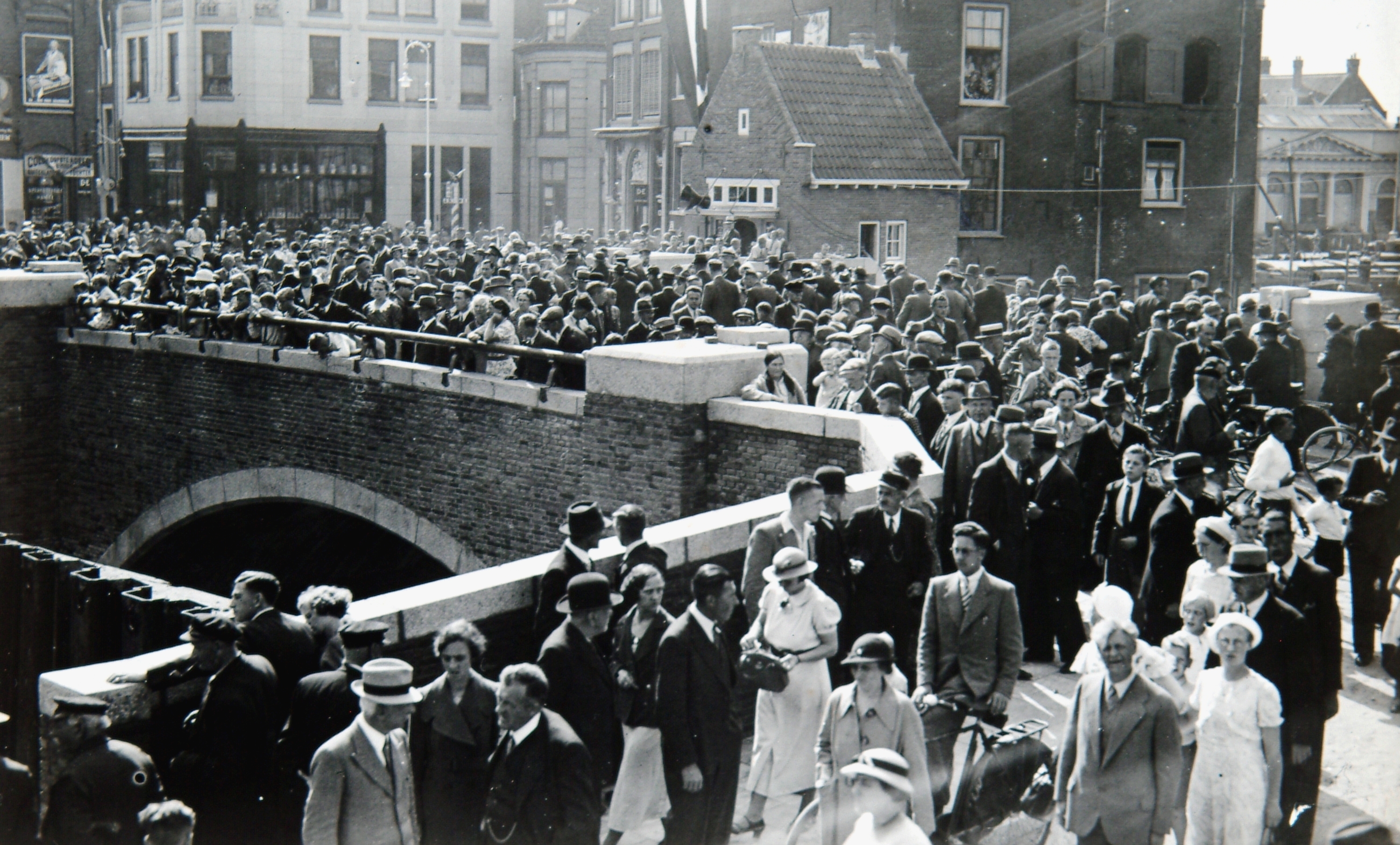 - Veel volk bij de opnening van de vernieuwde Leuvebrug, gezien vanaf Pottenkade richting Prinsenstraat. Geheel rechts de Korenbeurs aan de Bomkade.