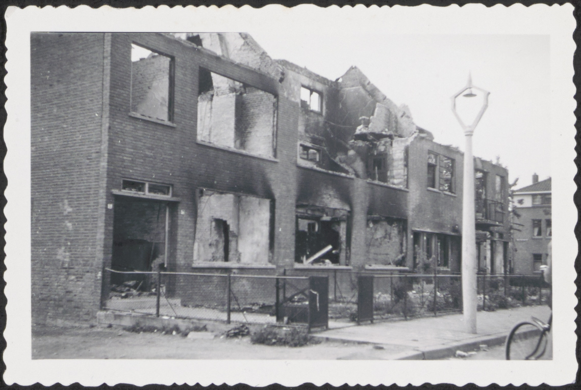- Getroffen huizen door het oorlogsgeweld in mei 1940 in de hoek Vincent van Goghstraat en de Weissenbruchstraat. Links op de voorgrond de David Blesstraat.