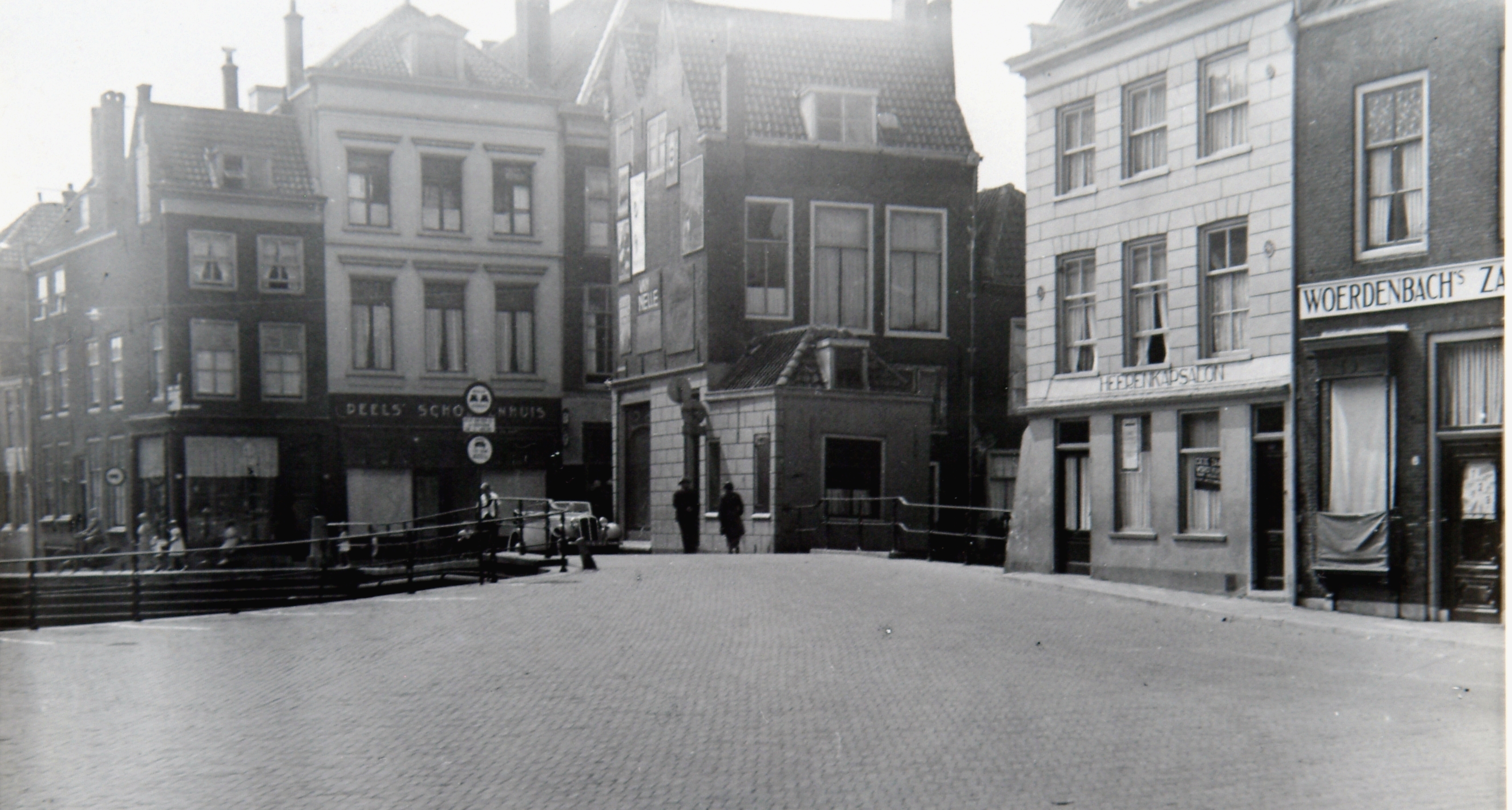 De Lombardbrug over de Voorstraatshaven vanaf het Stadhuisplein richting Voorstraat gezien. V.l.n.r. Lombardstraat, schoenhandel Peels, kruidenierswinkel Van Dijl, een herenkapsalon en zadelmakerij Woerdenbach.