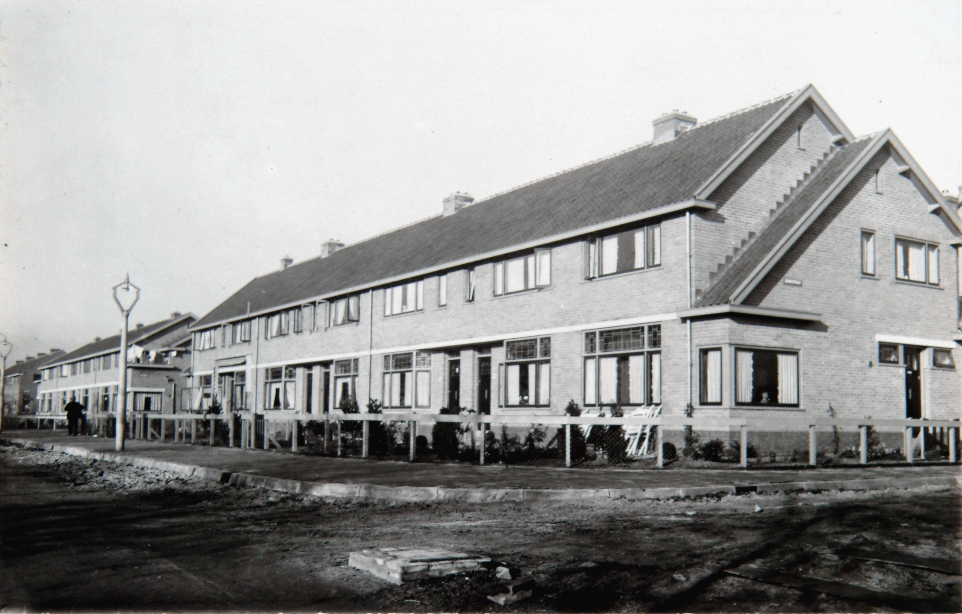 - De Maasstraat vanaf de Dongestraat in westelijke richting. De rioolput op de voorgrond kijkt nog boven de onverharde weg uit.