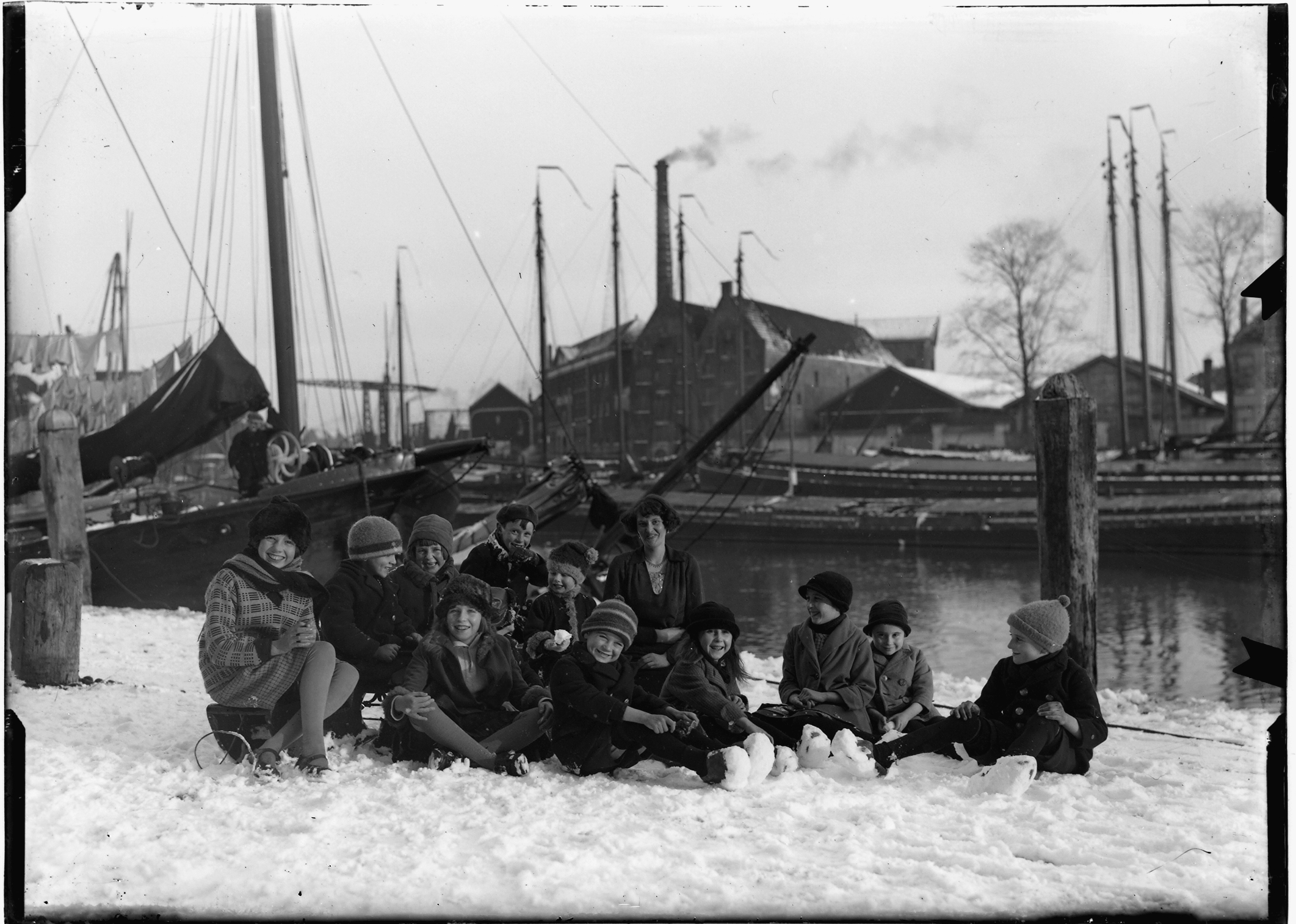 bruggen dukdalven / meerpalen fabrieken havens kinderen sneeuw zeilvaartuigen