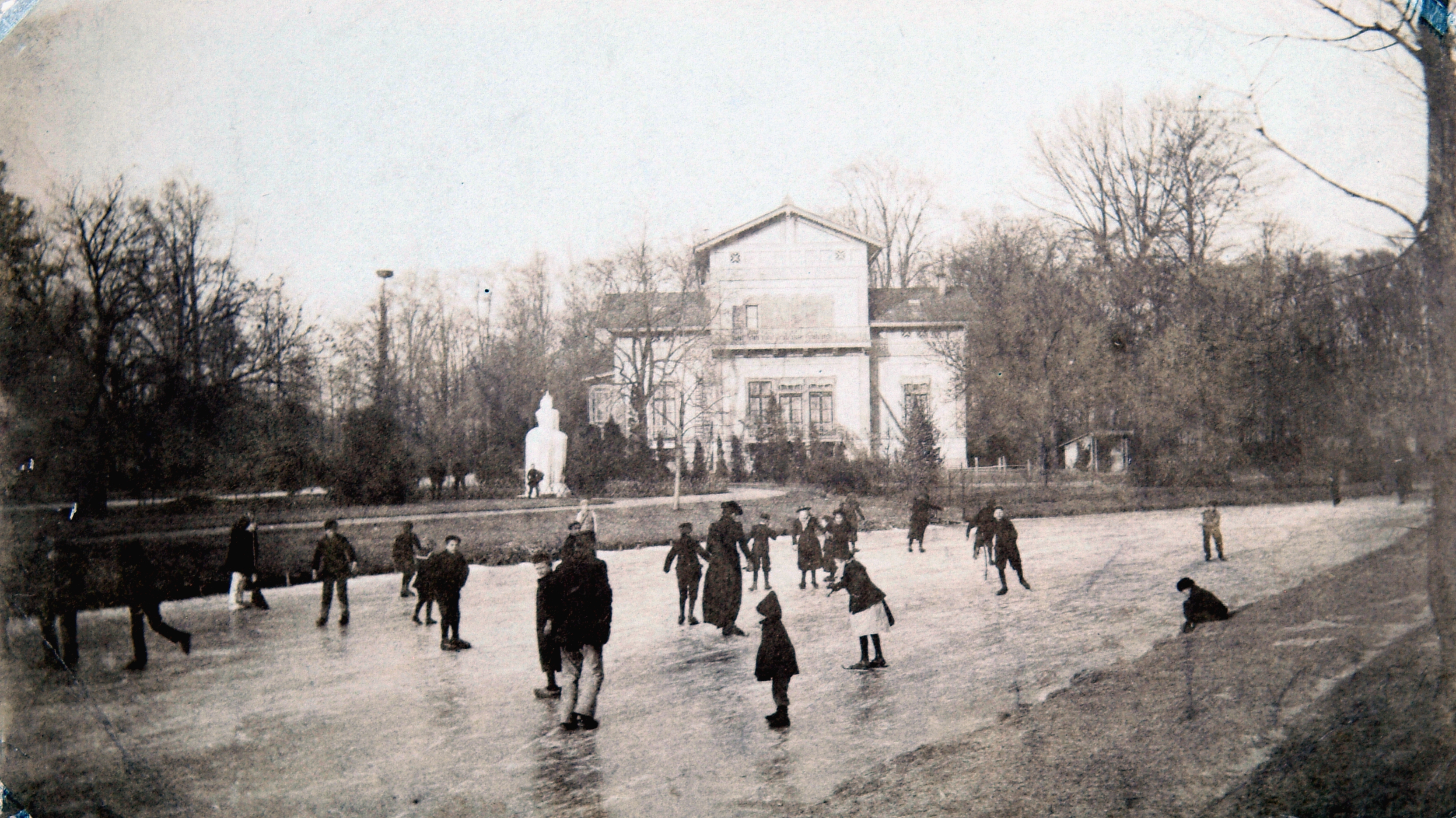 - IJspret op de vijver in park Merwestein langs de Groenedijk. In het park staat villa Merwestein. Opvallend is de bevroren fontein. De derde persoon van links is de baanveger. Links van de villa staat een boom met een ooievaarsnest.