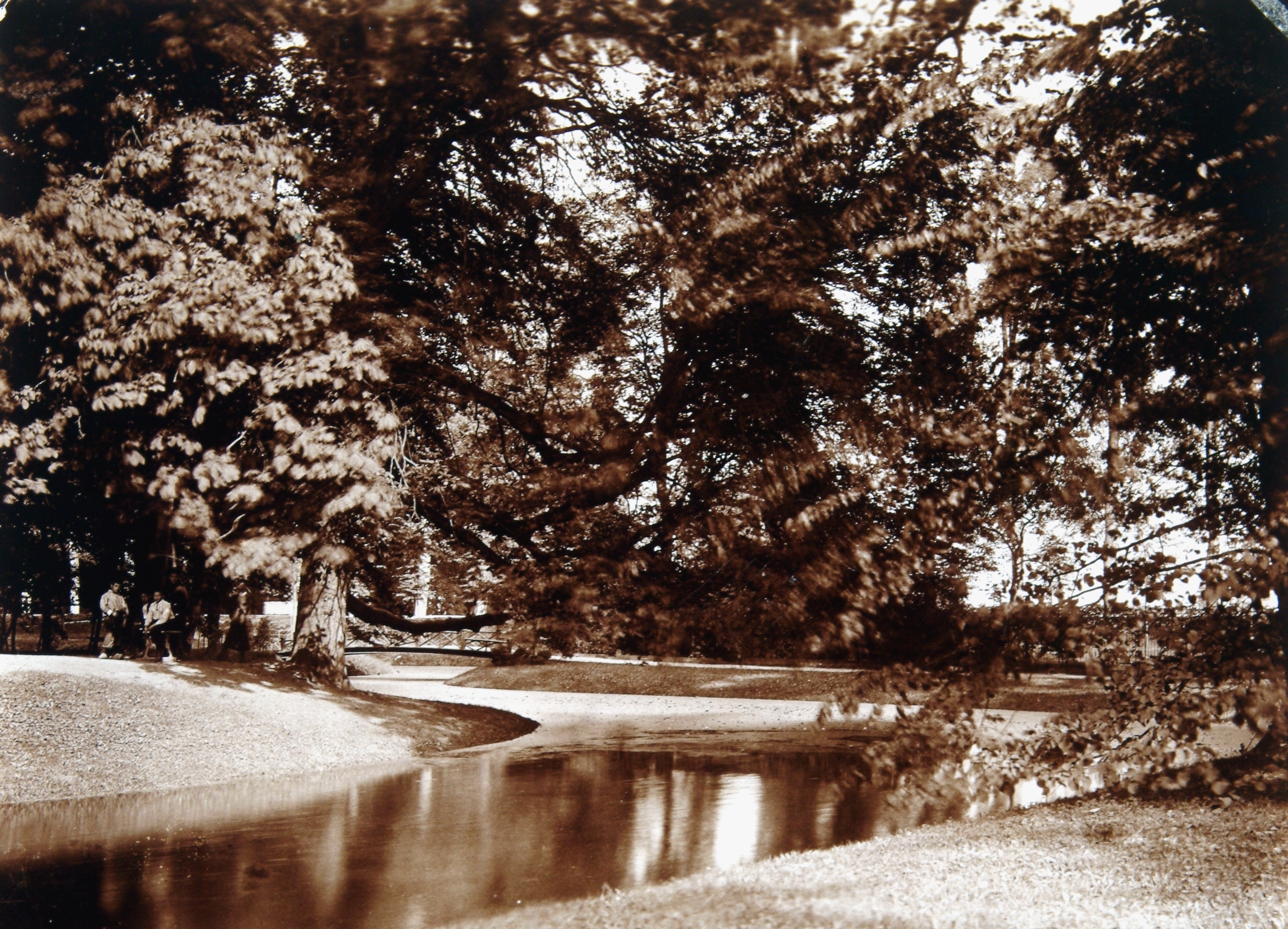De achtergrond toont het pad, welke gelijk oploopt met de Groenedijk. Het bruggetje is in gewijzigde vorm nagenoeg op dezelfde plek te vinden. Vanaf het standpunt van de fotograaf, staat de villa pal rechts(voor), het hertenkamp iets verderop links (achter). De tuinmanswoning bevindt zich achter alle bomen net buiten beeld links verderop. Het gedeelte links waar de mensen staan, is tegenwoordig niet meer toegankelijk en is afgezet met hekwerken.