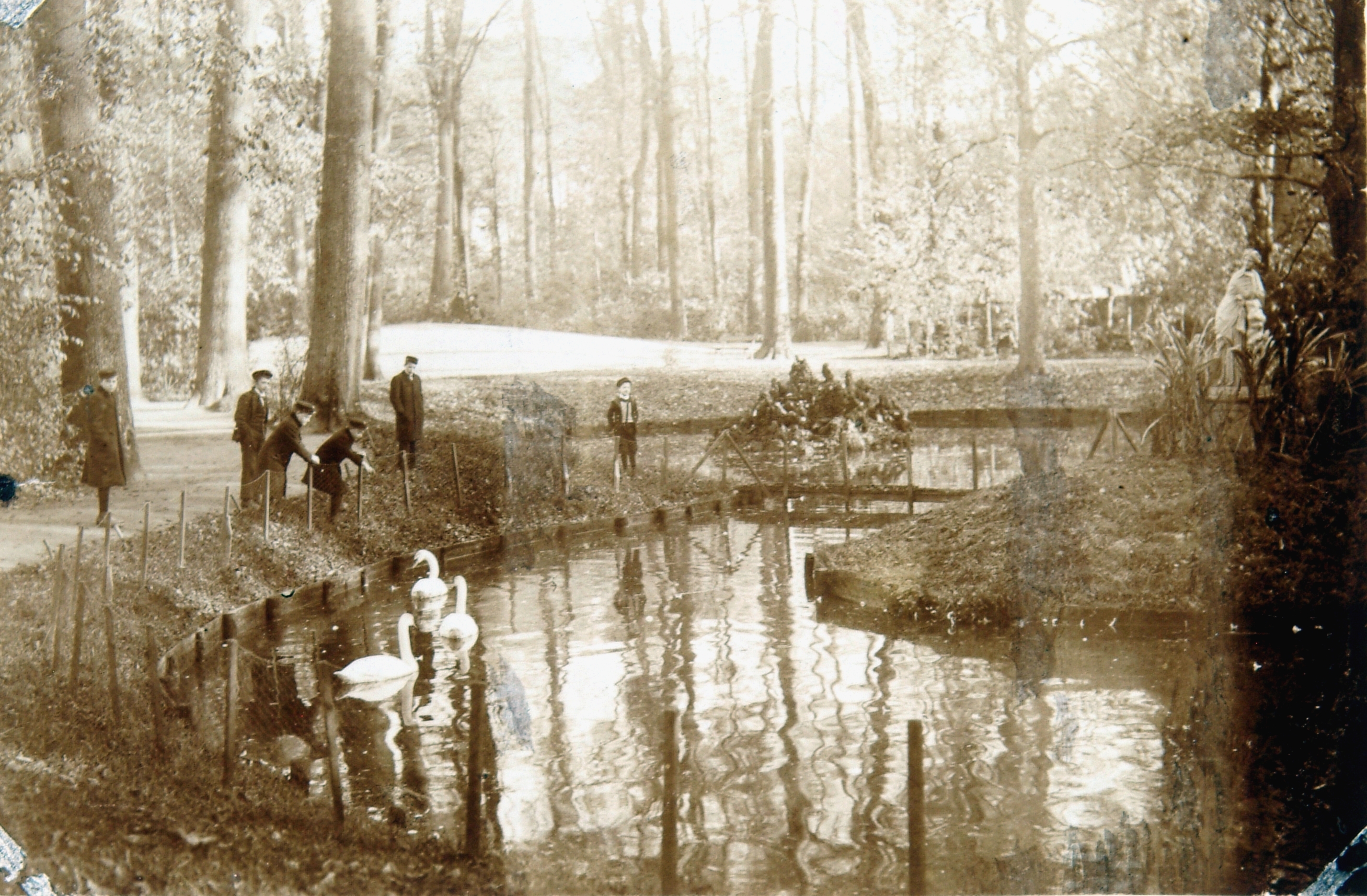 - De eendenvijver en de "hobbel" in Park Merwestein, gezien in de richting van de Hallincglaan. Rechts het standbeeld van een vrouwenfiguur.