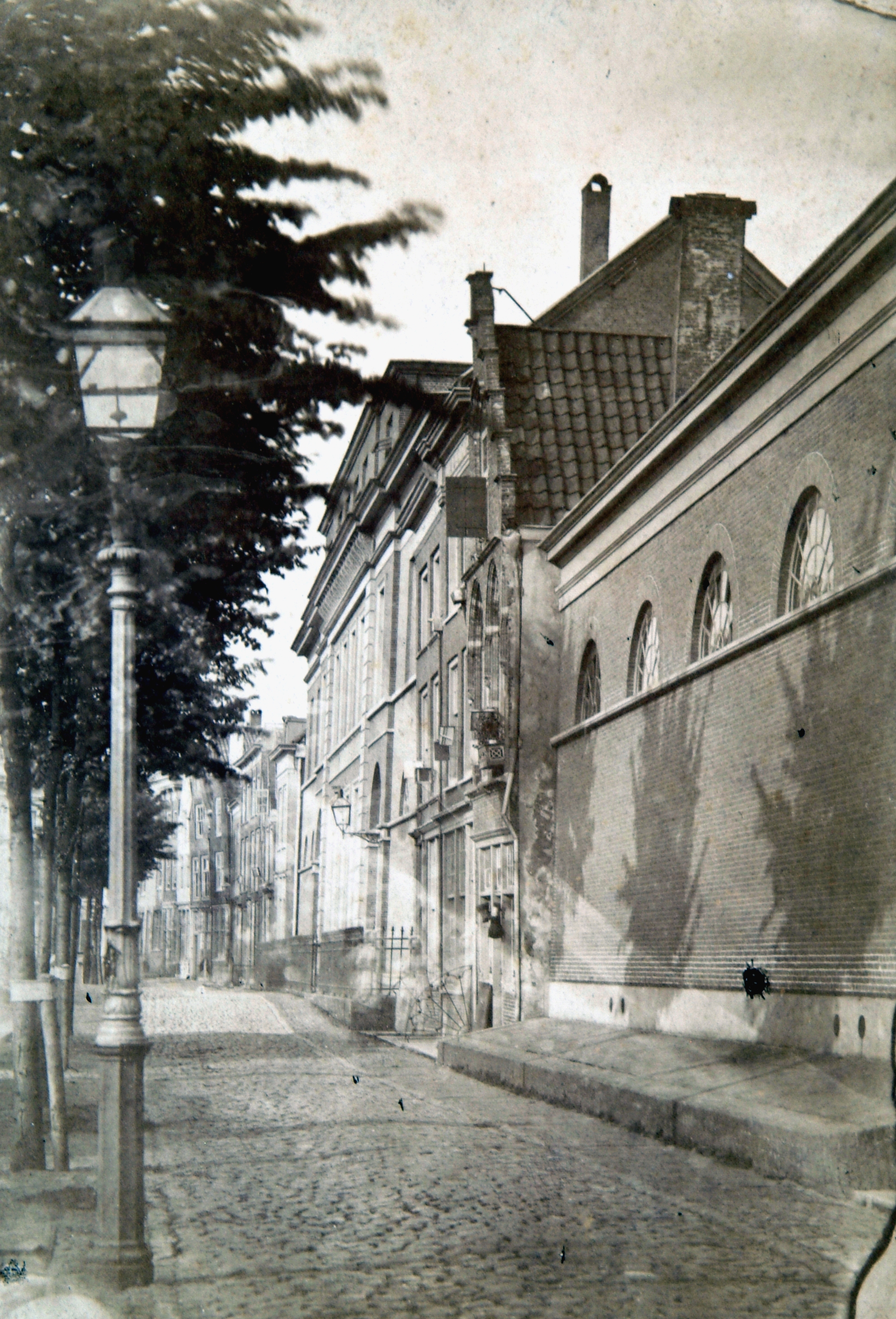 - Het krankzinnigengesticht in de Museumstraat - voorheen Lindengracht - gezien in de richting van het Steegoversloot. Het gebouw heette later 'Waarheid en Vrede' en werd daarna onderdeel van het Dordrechts Museum. Van juli 1902 tot ca. mei 1920 was er het 'Transvaalmuseum' gevestigd. Links van de bomen liep een gracht die in 1884 gedempt is.