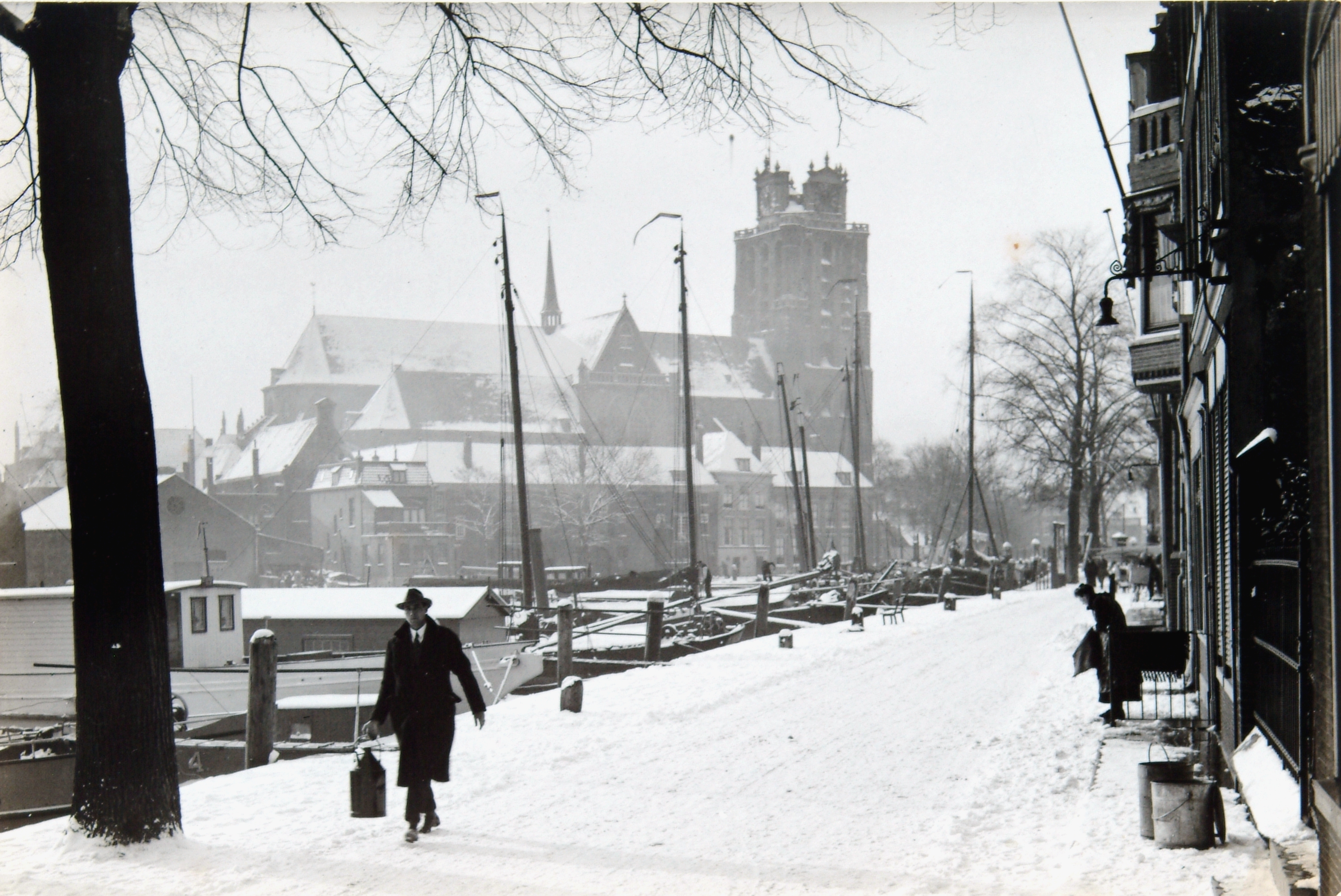 - De Nieuwe Haven in de richting van de Grote Kerk en de ervoor liggende Houttuinen met het Rijksmagazijn.