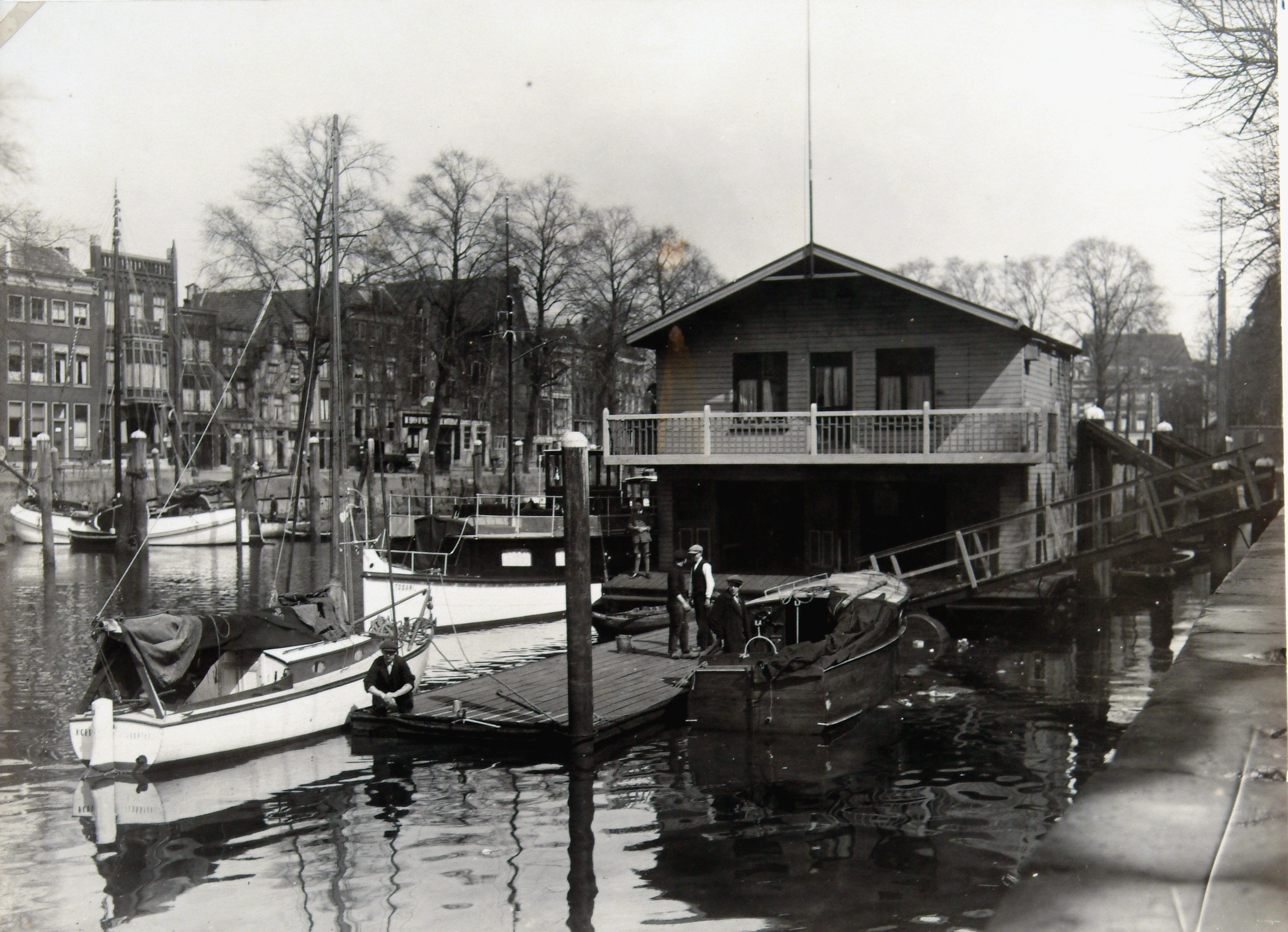 - Botenhuis van de roei- en zeilvereniging in de Nieuwe Haven, gezien vanaf de Knolhaven in de richting van de Roobrug.