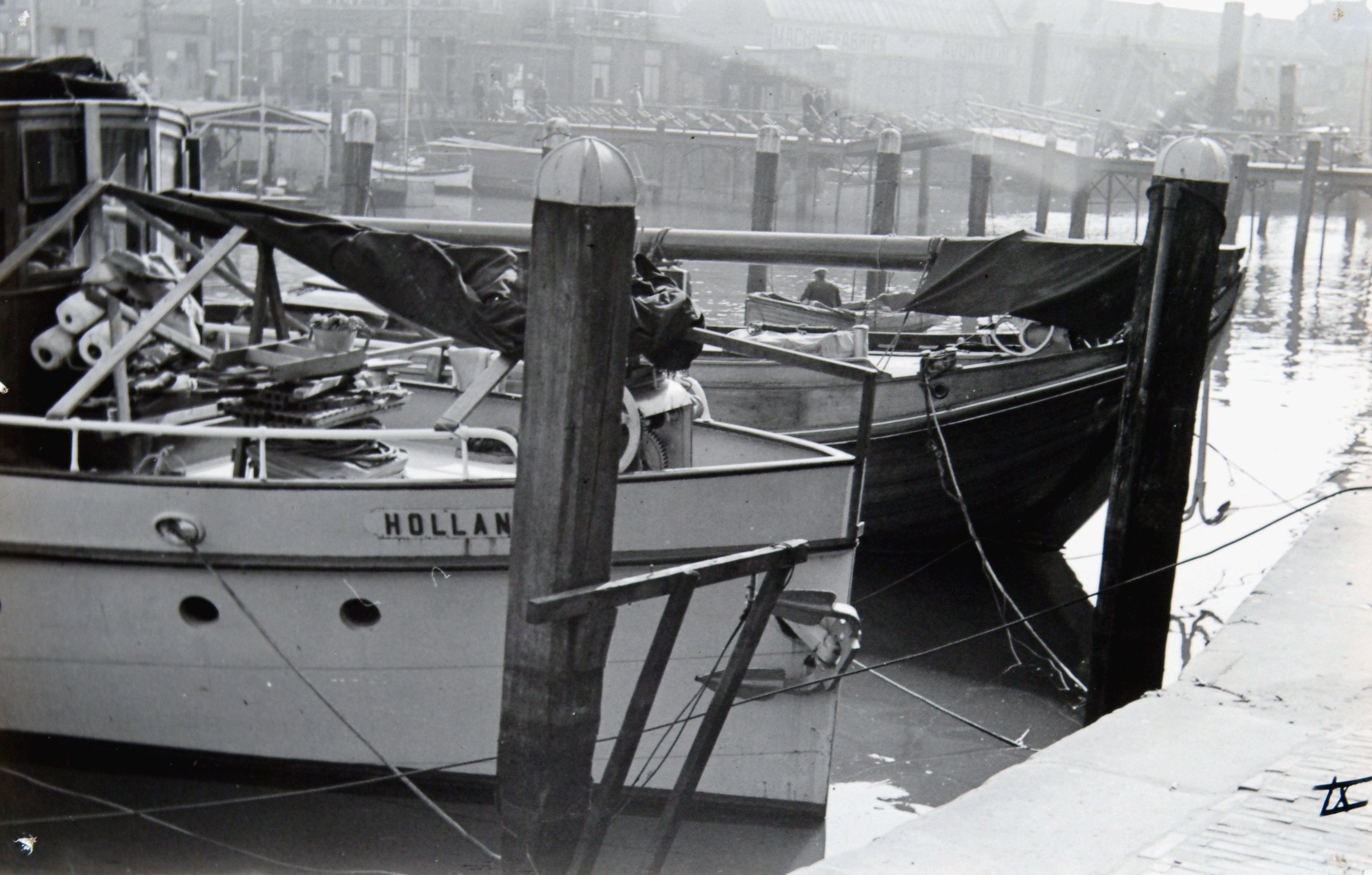 - Afgemeerde plezierboten in de Nieuwe Haven. Links op de achtergrond het visvlot van firma V.d. Pluijm. Rechts achter de Lange IJzerenbrug enige sleepboten.