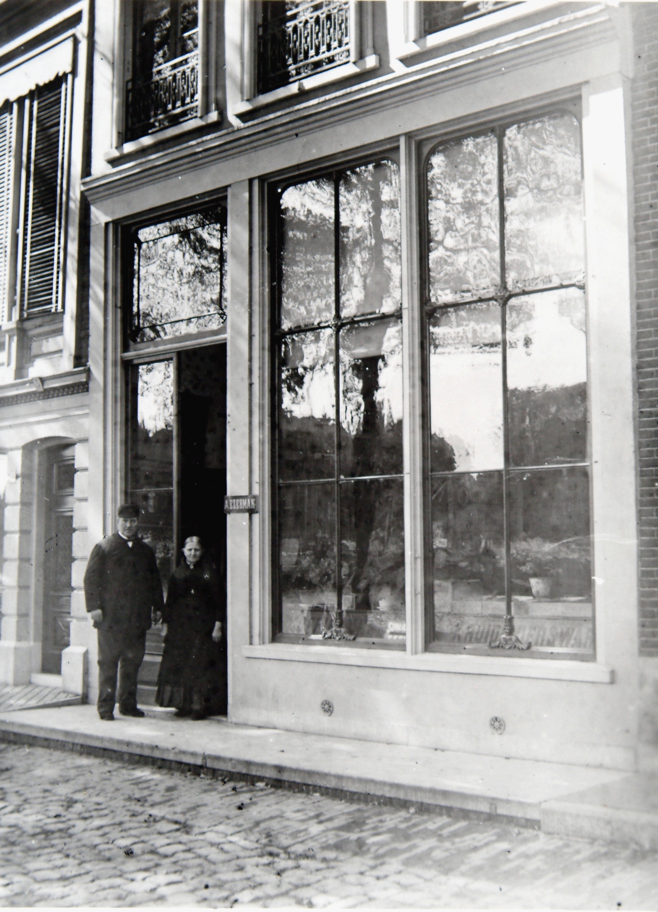 - De kruidenierswinkel van A. Ezerman aan de Nieuwe Haven nr. 3. Waarschijnlijk staan de heer en mevrouw Ezerman zelf voor de deur van hun winkel.