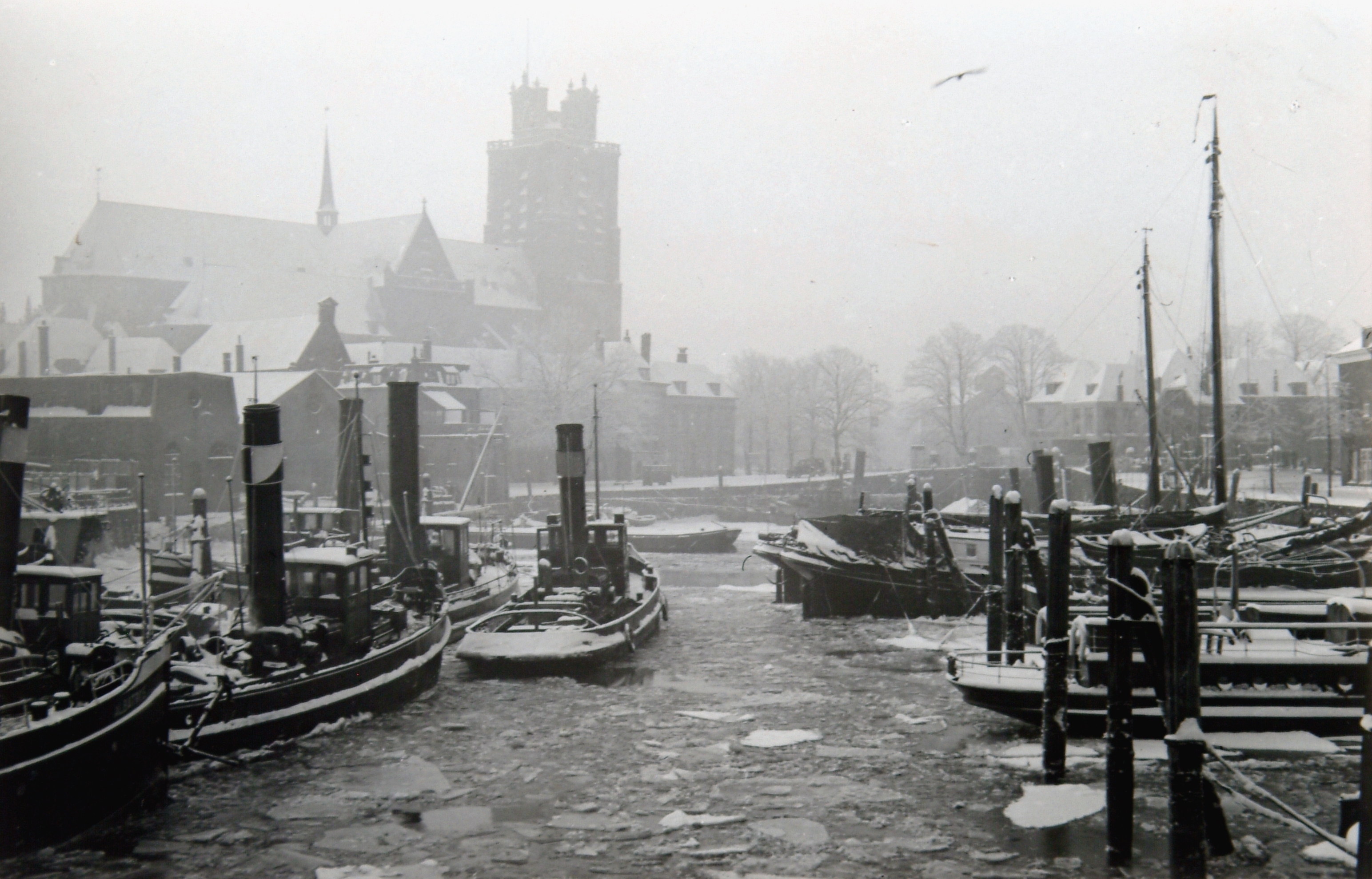 - Met ijsschotsen bedekte Nieuwe Haven vanaf Lange IJzerenbrug richting Houttuinen en Grote Kerk. Rechts van het midden de Engelenburgerbrug.