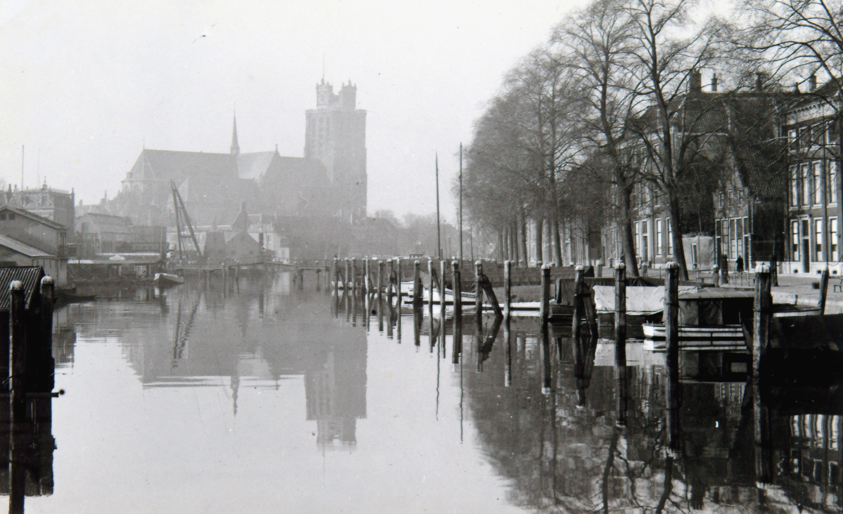 De Nieuwe Haven vanaf Aardappelmarkt richting Lange IJzerenbrug, Houttuinen en Grote Kerk. Links het botenhuis van de Roei- en zeilvereniging en het visvlot van A. v.d. Pluijm