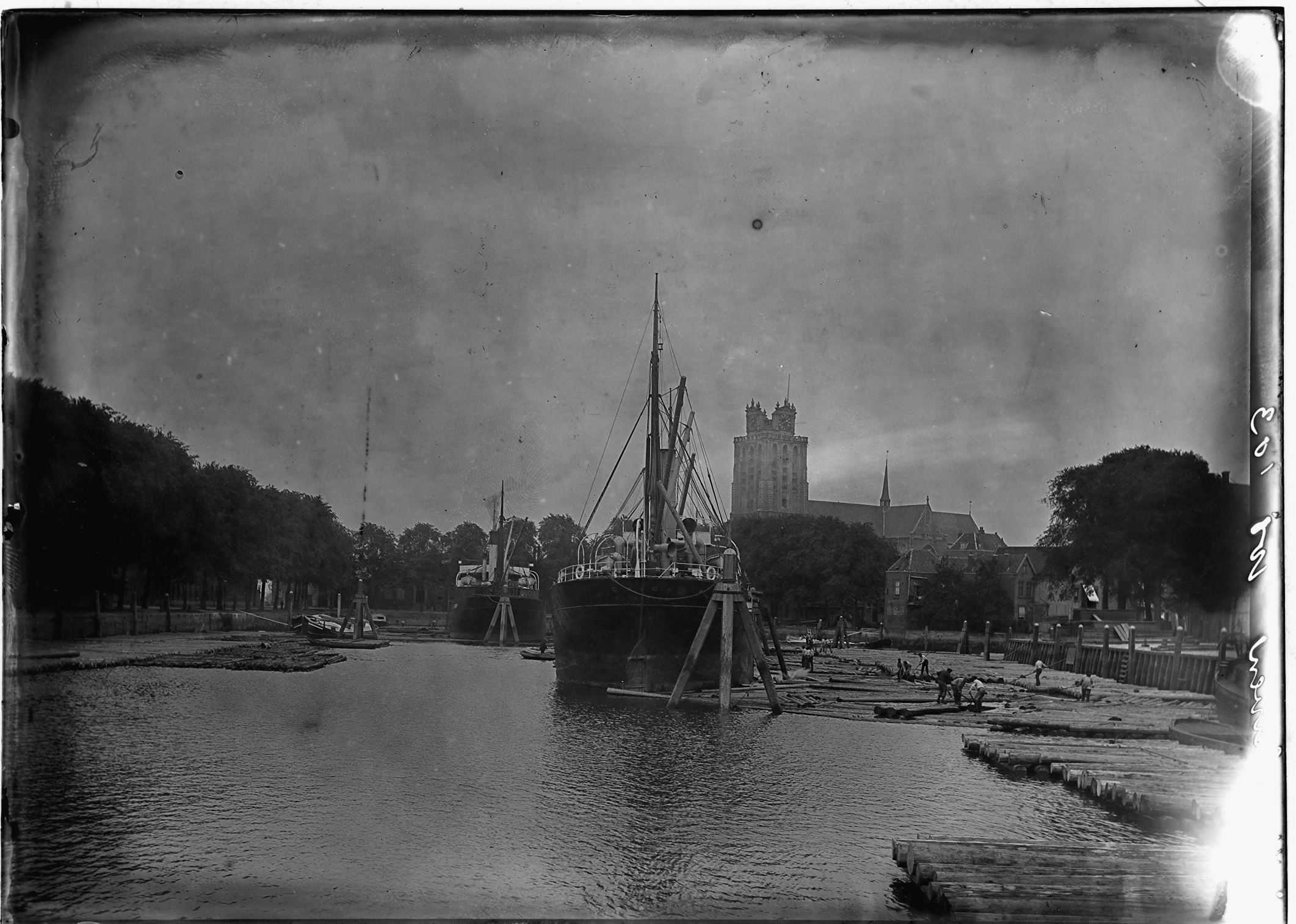 - Kalkhaven vanaf de Draai richting Grote Kerk. Rechts de achterkant van huizen aan de Kleine Kalkstraat vlakbij de monding van de Spuihaven. Geheel rechts een deel van het Achterhakkers.