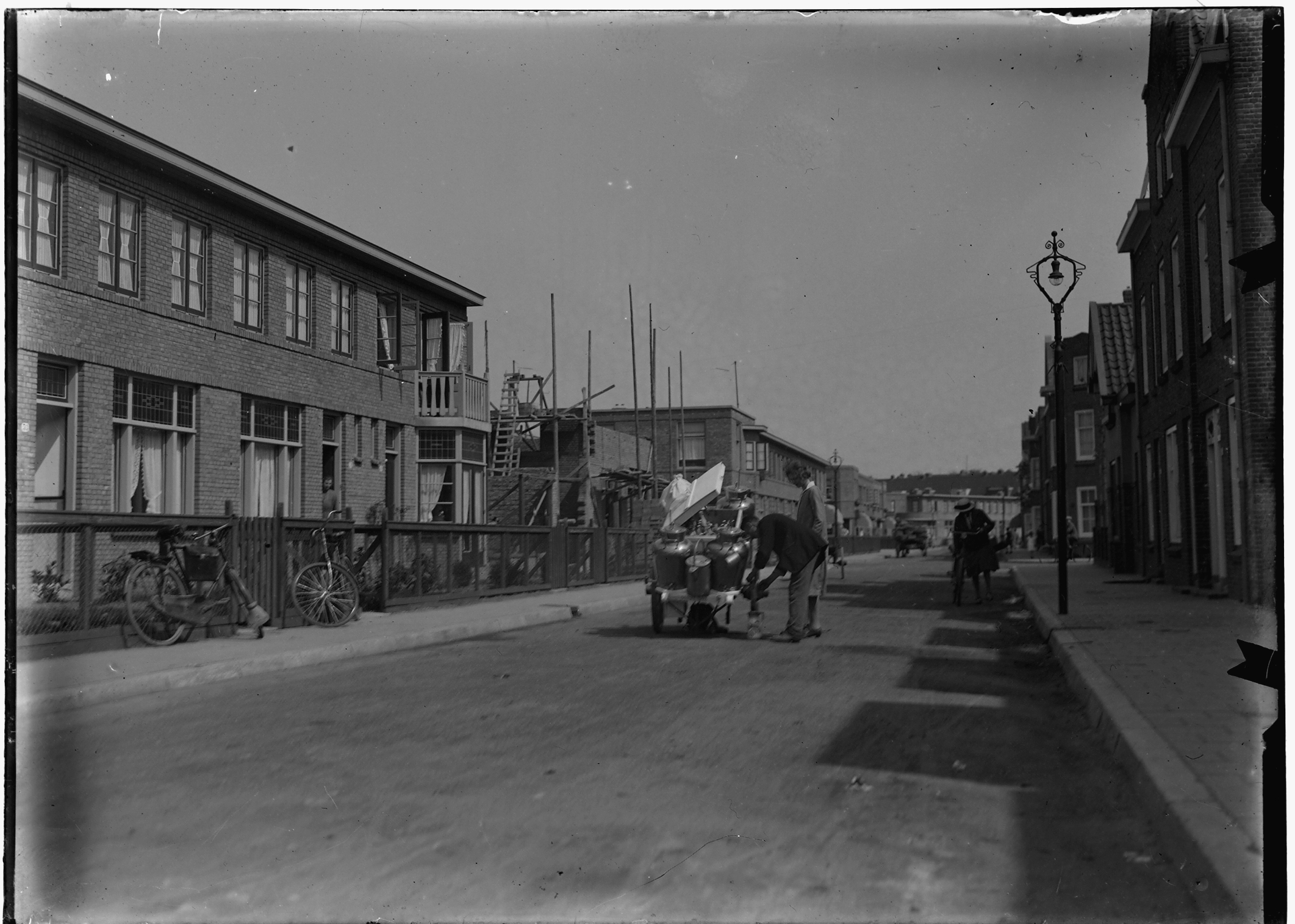 - balkons bouwwerkzaamheden fietsers hondenkarren lantaarns / straatverlichting melkboeren