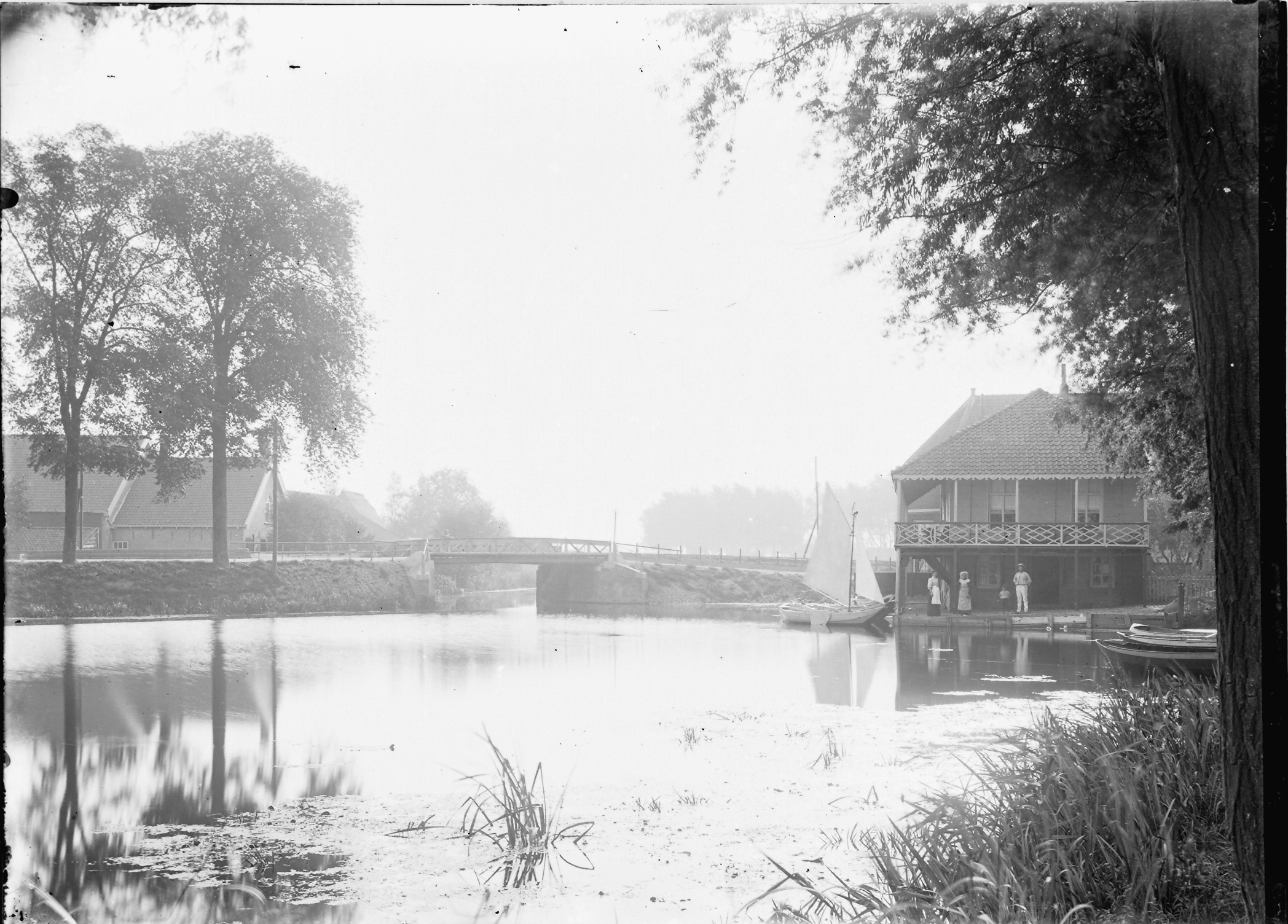 Brug over de Waal in Rijsoord. Rechts hotel/pension Vink aan de Rijksstraat en links de …
