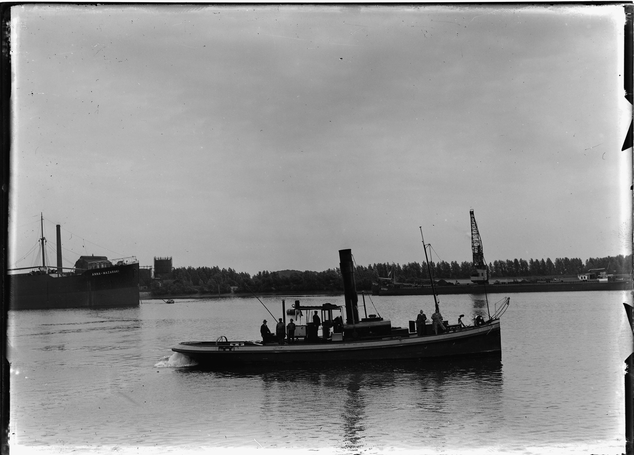 Zicht op zuidzijde Wilhelminahaven (Zeehaven). Links de opslagtanks van de NV Stikstofbindingsindustrie "Nederland" (aldaar gevestigd vanaf 1920 tot 1952). Zie ook 555_21138 en 552_332565.