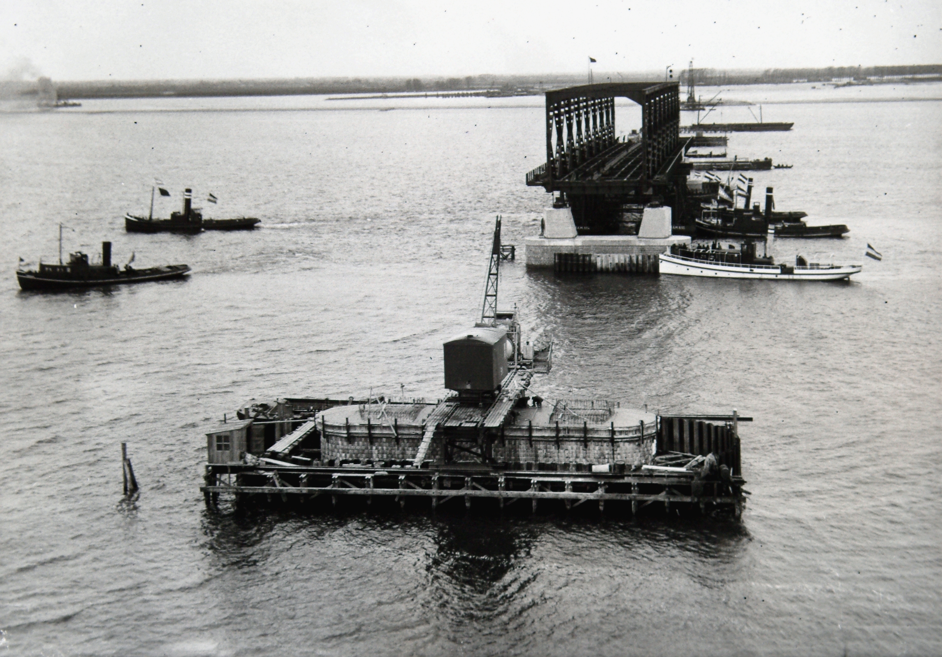 - Aanleg Moerdijkbrug. Als eerste wordt de overbrugging tussen pijler 2 en 3 gelegd. Gezicht vanaf de Brabantse wal.