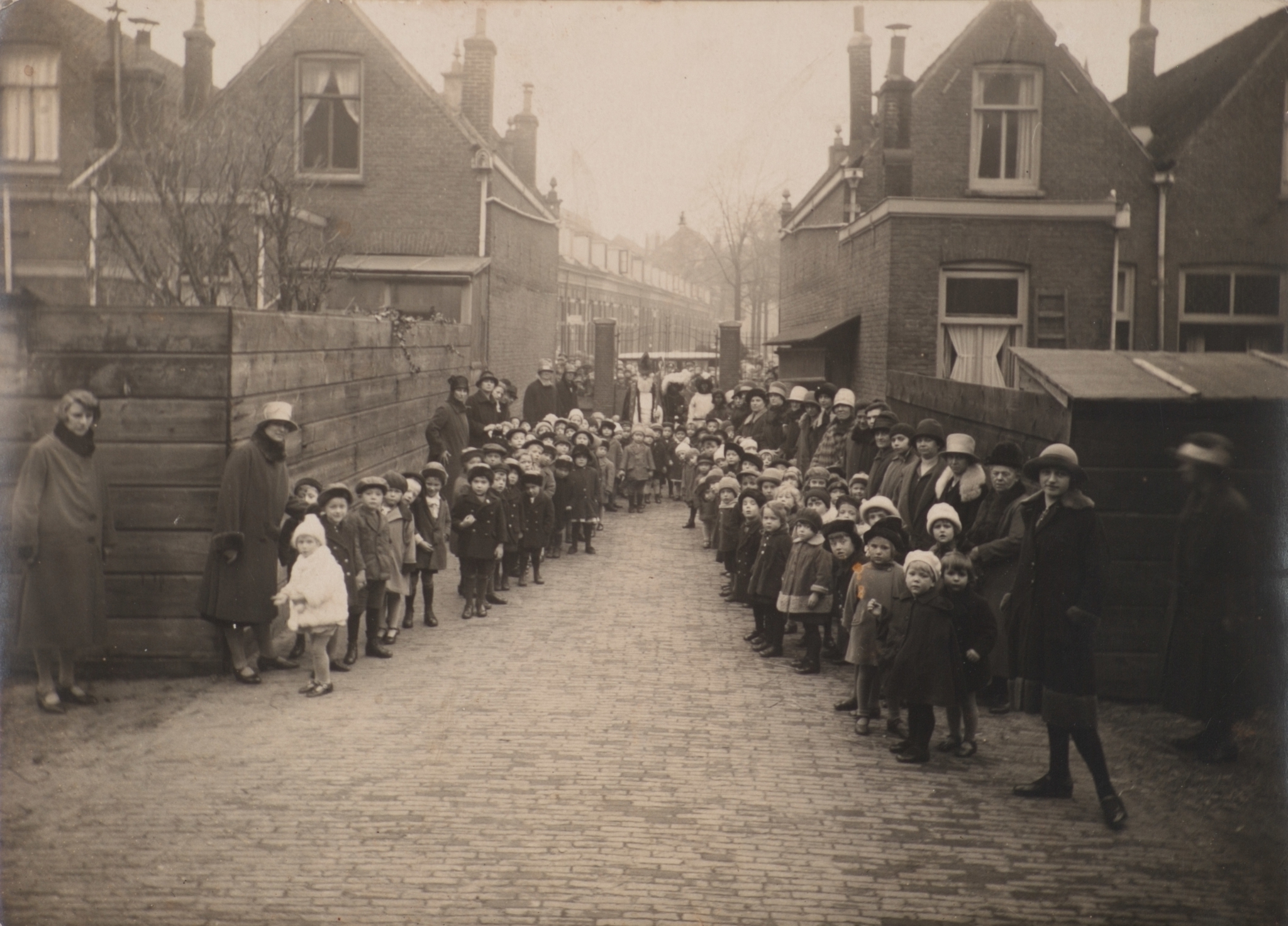 - Sinterklaas en twee zwarte pieten op bezoek bij leerlingen en juffen van de bewaarschool in het Geldelozepad. Op de achtergrond de Generaal Van der Heijdenstraat.